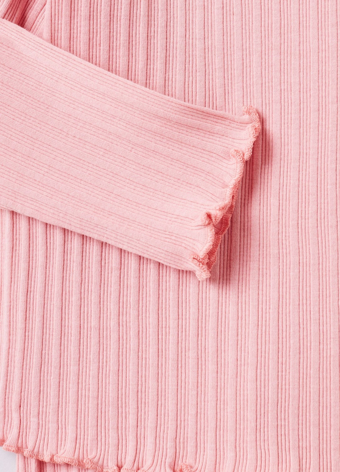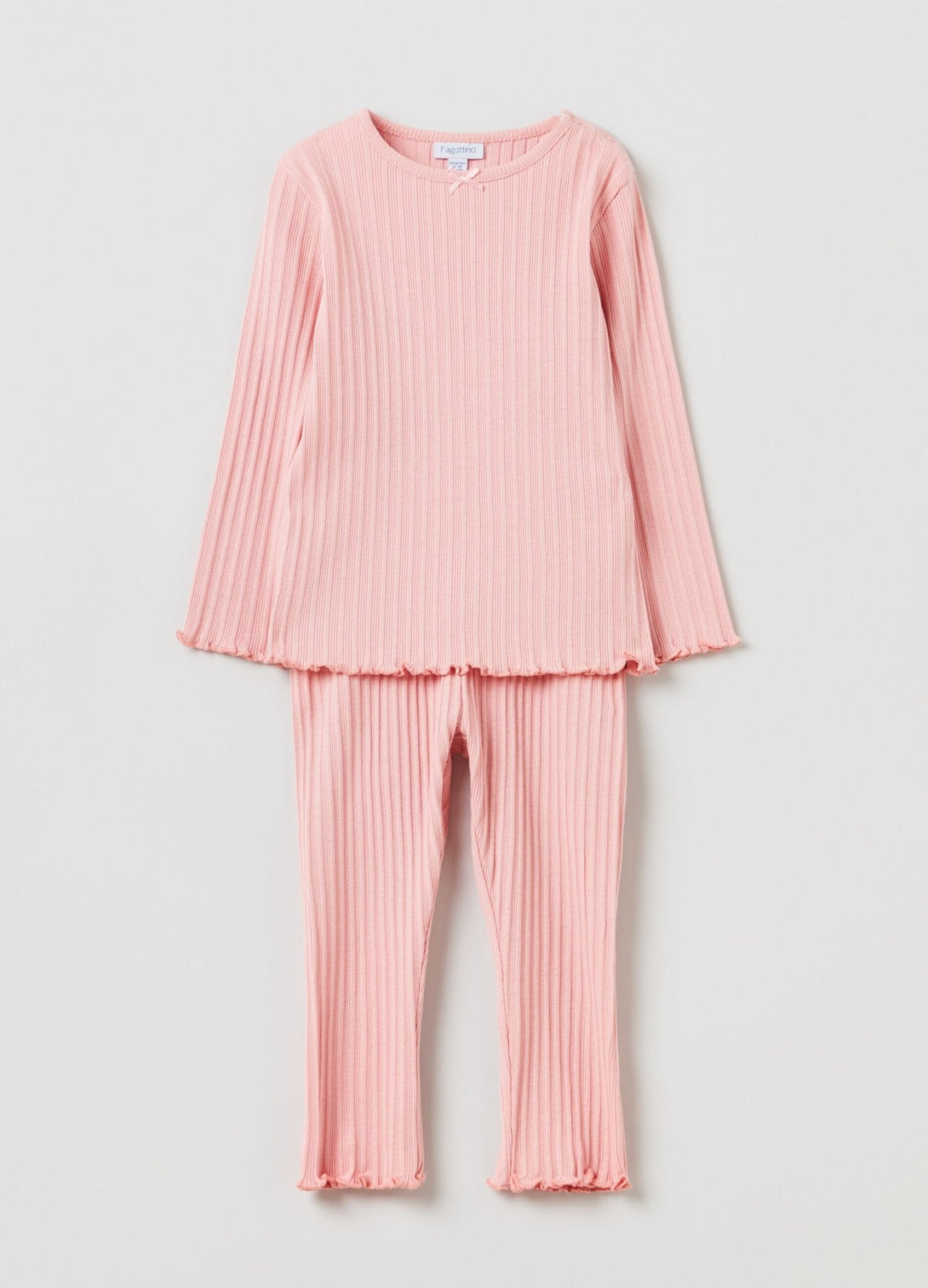 بلوزة برقبة مستديرة وأزرار كبس على الكتف. بنطلون بحزام خصر مطاطي. حواف متموجة.