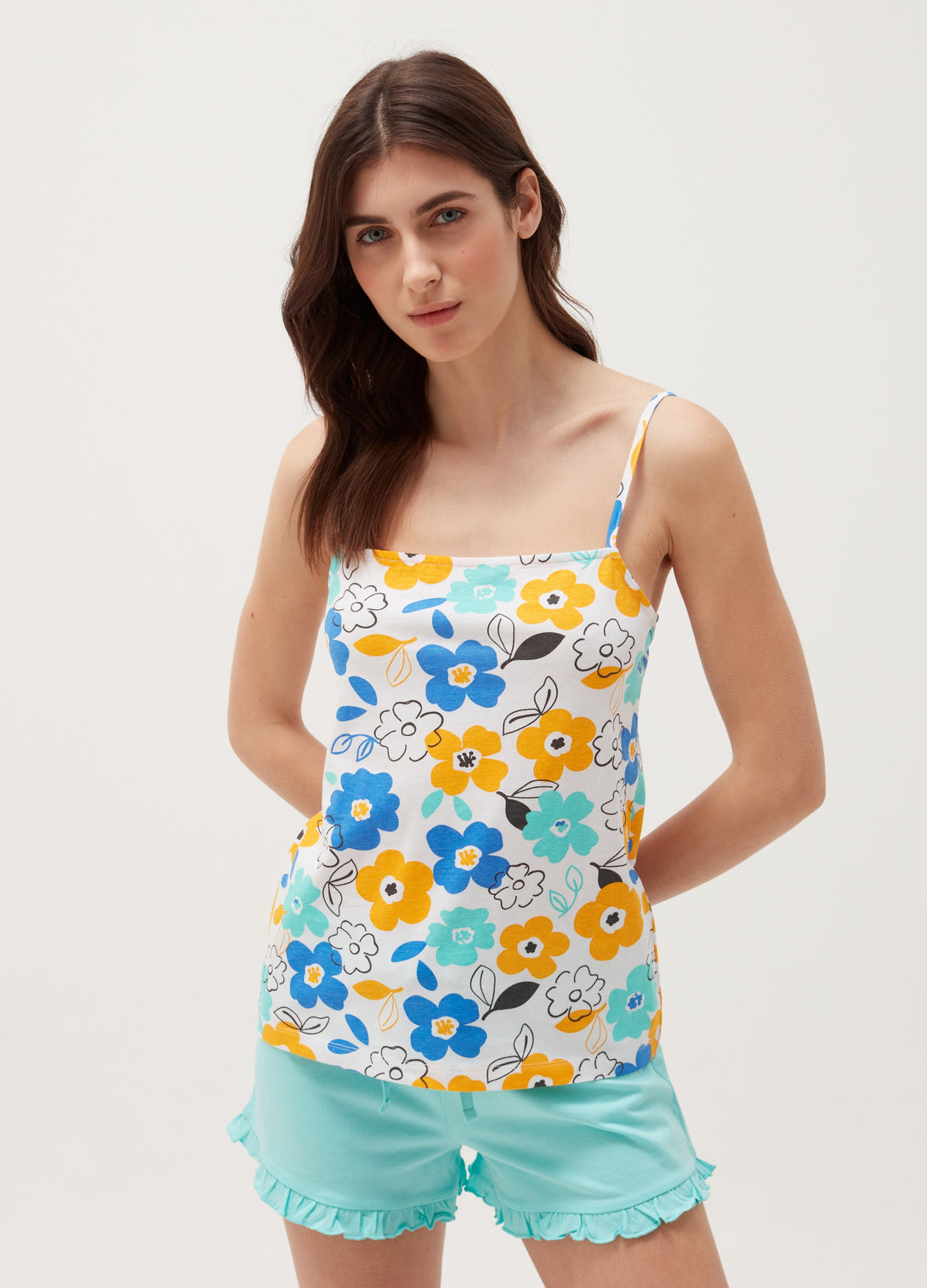 طقم بيجاما قصير كامي وكشكش للنساء من اوه في اس