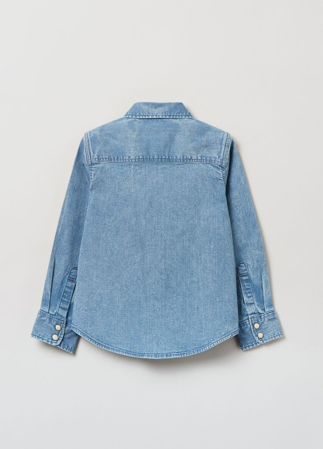 قميص جينز من القطن القابل للتمدد بنسيج مقلّم. طوق بلاف. نير في الأمام والخلف. جيبان مع أغطية وأزرار. زر كبس بنمط عرق اللؤلؤ.