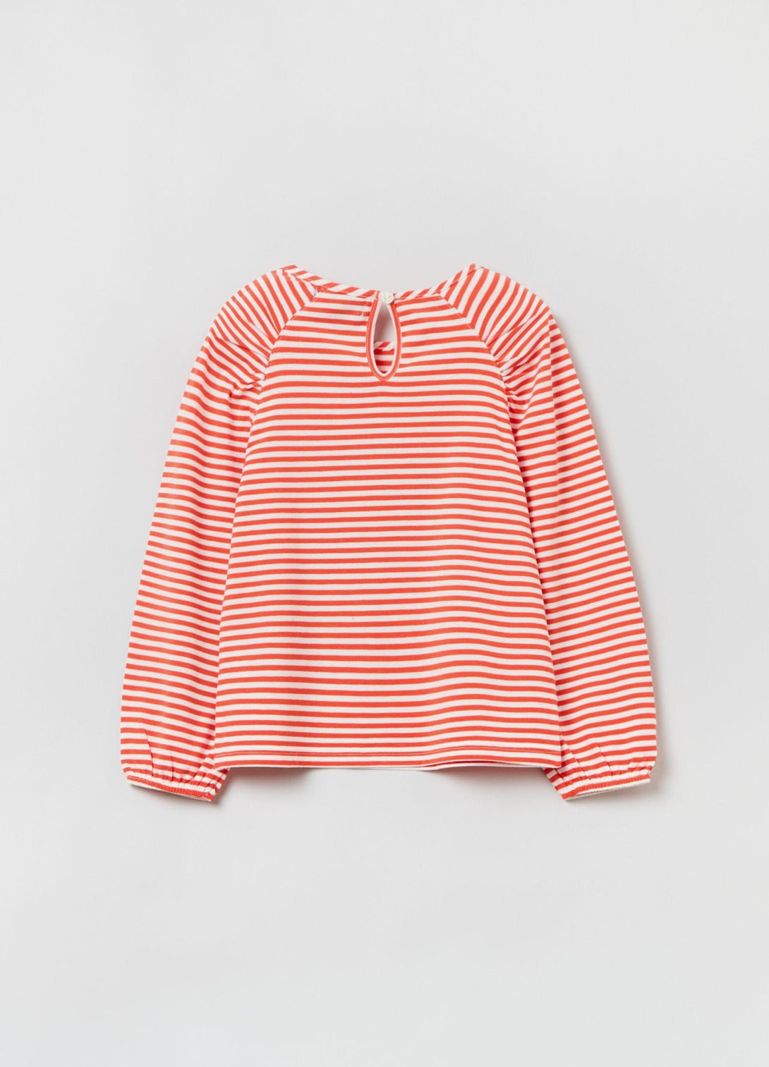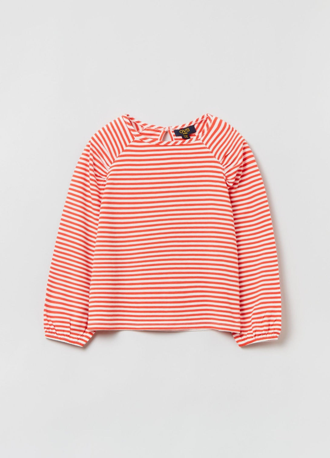 تي شيرت مخطط من القطن القابل للتمدد مع رقبة مستديرة. أكمام ريجلان منفوشة بأساور مطاطية. فتحة المفتاح مع زر للإغلاق في الخلف.