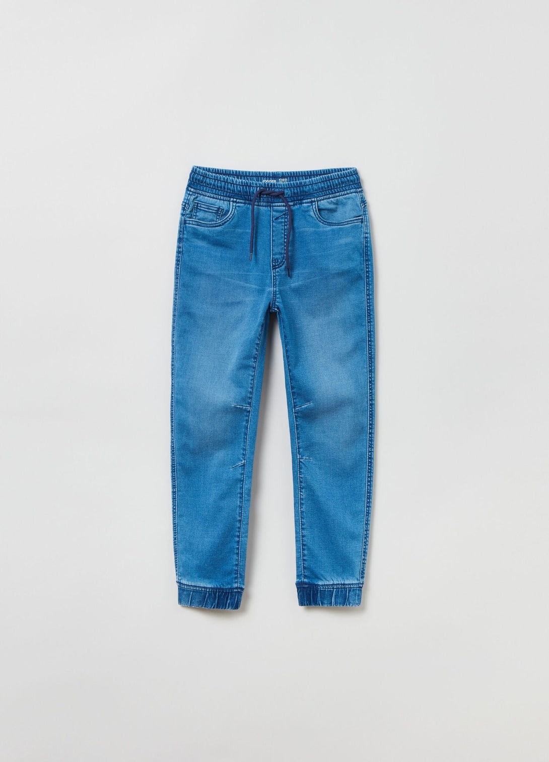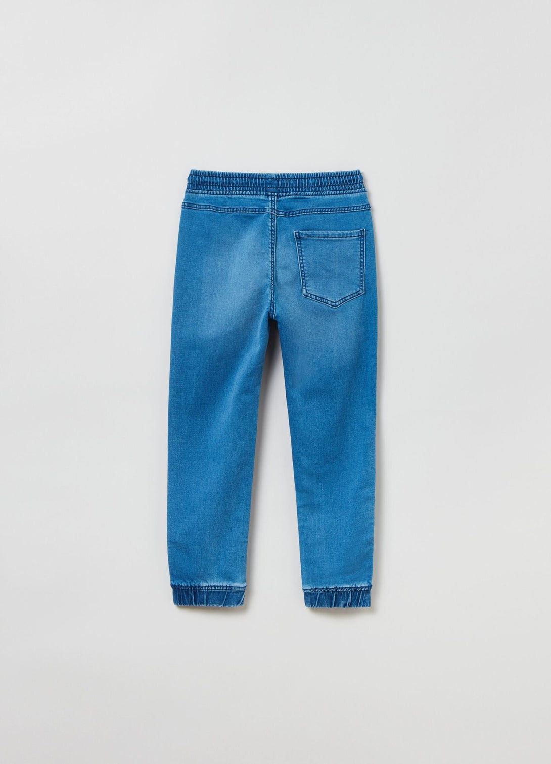 بنطلون رياضي من الدنيم القطني المطاطي بمظهر متباين مع رباط. جيبان جانبيان داخليان وجيب للعملات. جيب خلفي خارجي واحد. حزام خصر مطاطي وكاحلين.