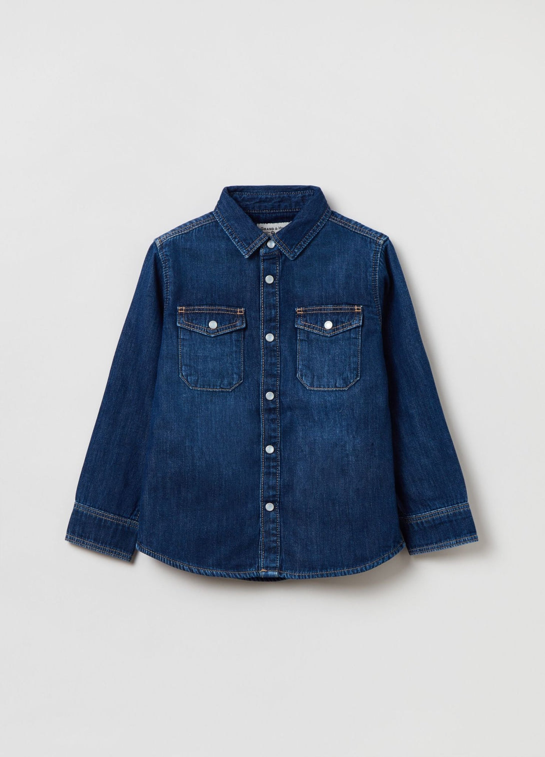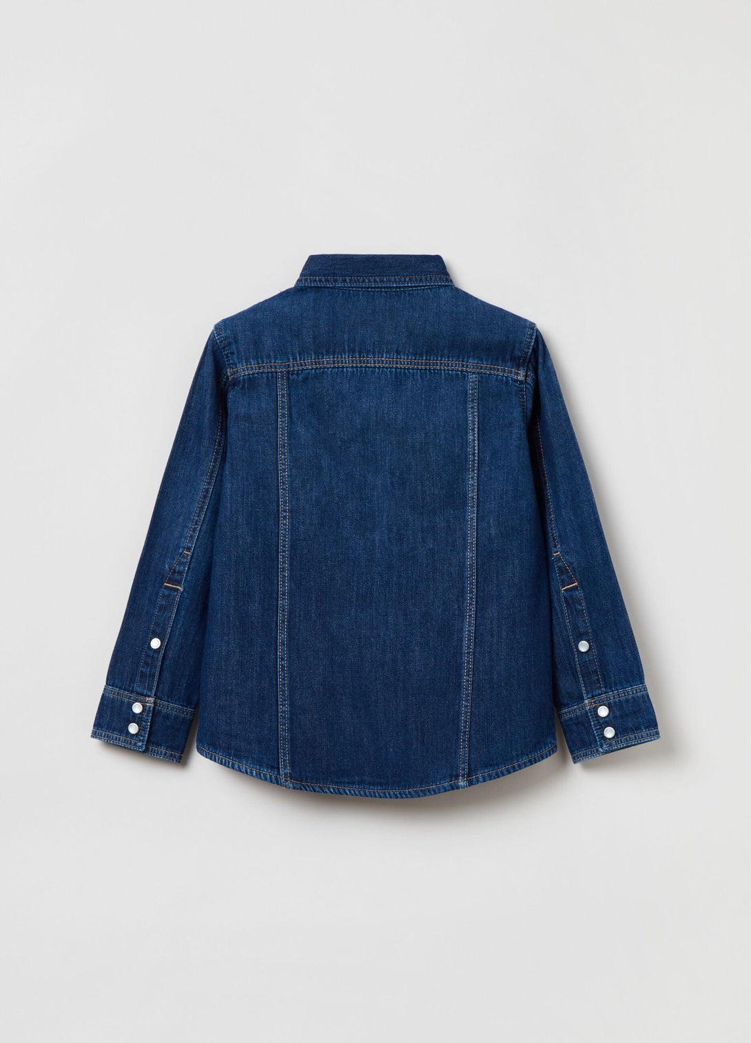 قميص مصنوع بنسبة 100% من قطن الدنيم والقطن وبطانة من الفسكوز. طوق كوتاواي. نير وخياطة عمودية على الظهر. جيبان مع غطاء وزر على الصدر. إغلاق بواسطة زر كبس.