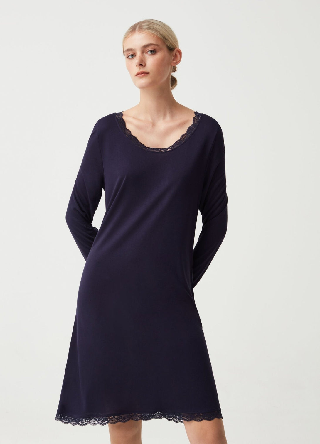 فستان نوم مصنوع من الفيسكوز بنسبة 100% مع حواف من الدانتيل. أكمام طويلة. رقبة مستديرة واسعة.