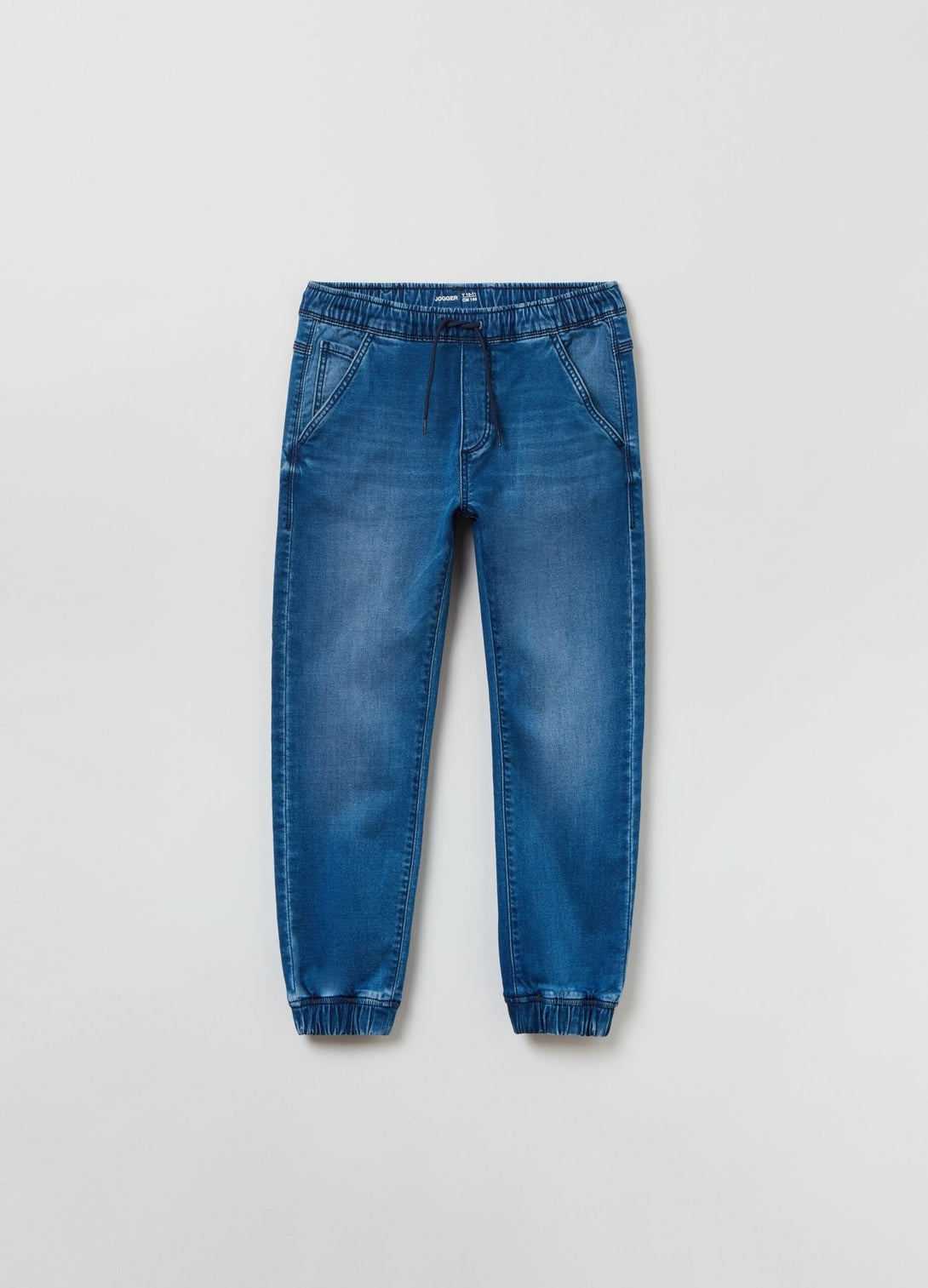 بنطال رياضي من الدنيم القطني القابل للتمدد مع تلاشي اللون. خمسة جيوب. حزام خصر مطاطي وكاحلين.