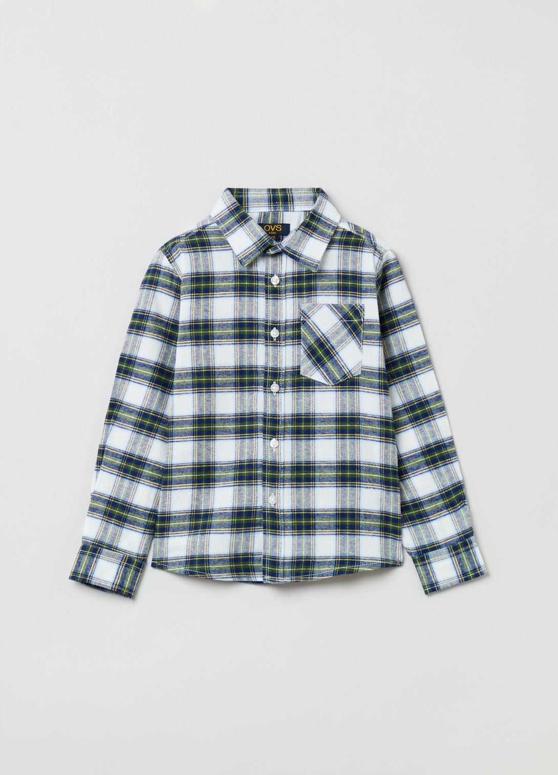 قميص من الفلانيل مصنوع من القطن بنسبة 100%. تحقق من النمط. طوق كوتاواي. نير مع طية على الظهر. جيب خارجي واحد على الصدر. إغلاق كلاسيكي بأزرار.