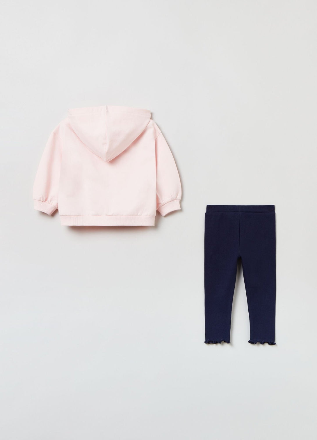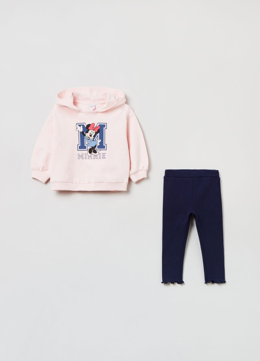 مجموعة الركض الفرنسية المصنوعة من القطن القابل للتمدد (بطانة من الصوف غير المصقول). بلوزة بغطاء للرأس وتفاصيل مضلعة على خط العنق. طبعة ديزني بيبي ميني ماوس لامعة على الأمام. أساور وحافة مضلّعة. بنطال ضيق بحزام خصر مطاطي وحافة مكشكشة.