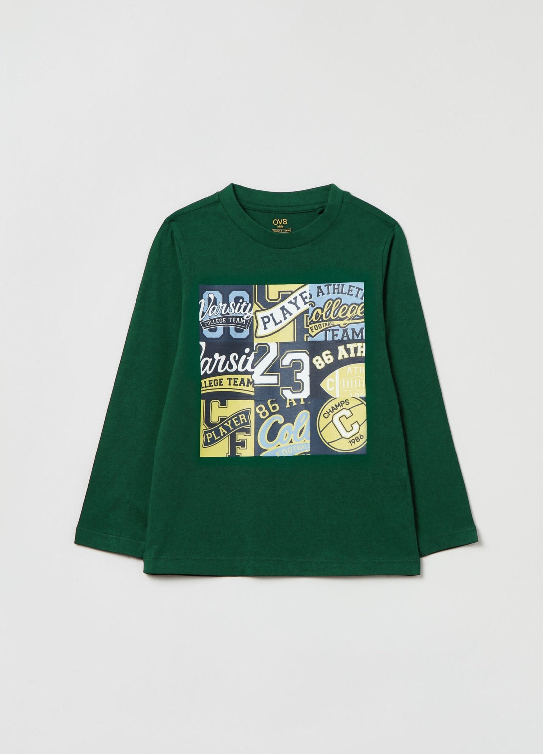 تي شيرت مصنوع من القطن بنسبة 100% بأكمام طويلة. رقبة مستديرة. طباعة حروف جامعية.
