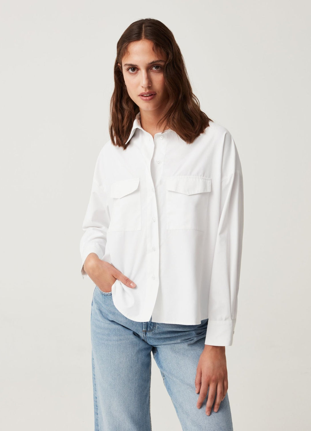 قميص من مزيج القطن. مقاس كبير مع أكتاف منسدلة. طوق كوتاواي. جيبان خارجيان مع طيات على الصدر. إغلاق كلاسيكي بأزرار.