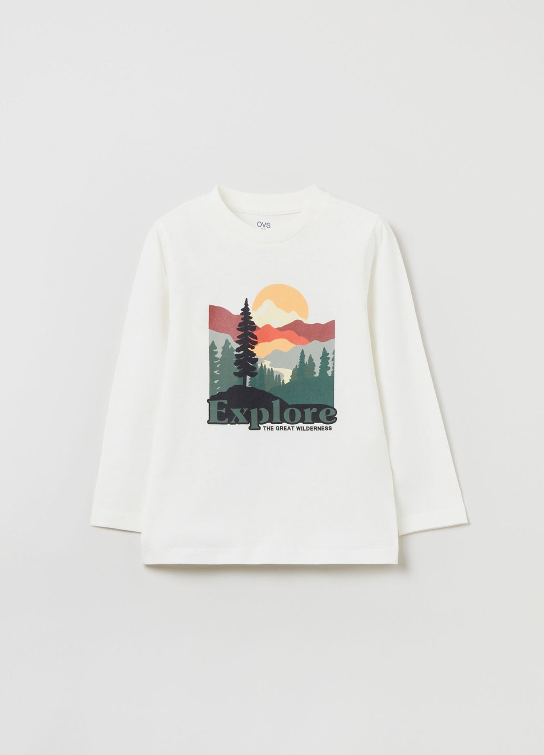 تي شيرت مصنوع من القطن بنسبة 100% بأكمام طويلة. رقبة مستديرة. طباعة الجبال والحروف على الجهة الأمامية.