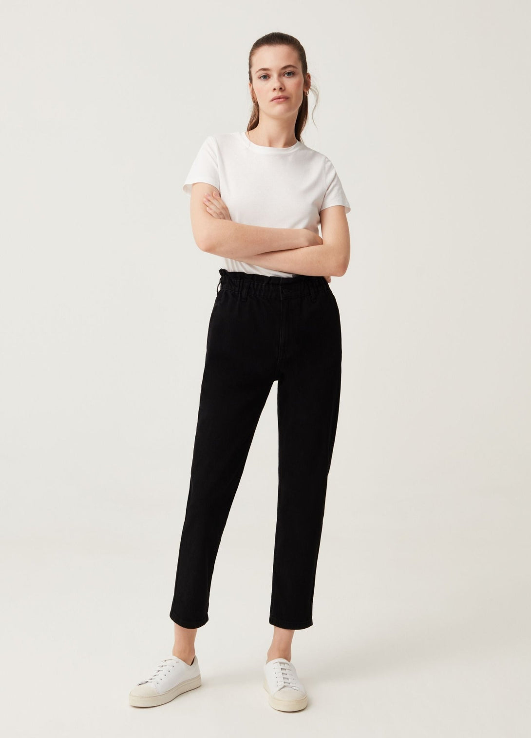 بنطال جينز بقصة فضفاضة من القطن بنسبة 100%. خصر مطاطي عالي مع زخرفة. جيبان عموديان وجيبان خارجيان في الخلف. إغلاق بواسطة سحّاب وزر.