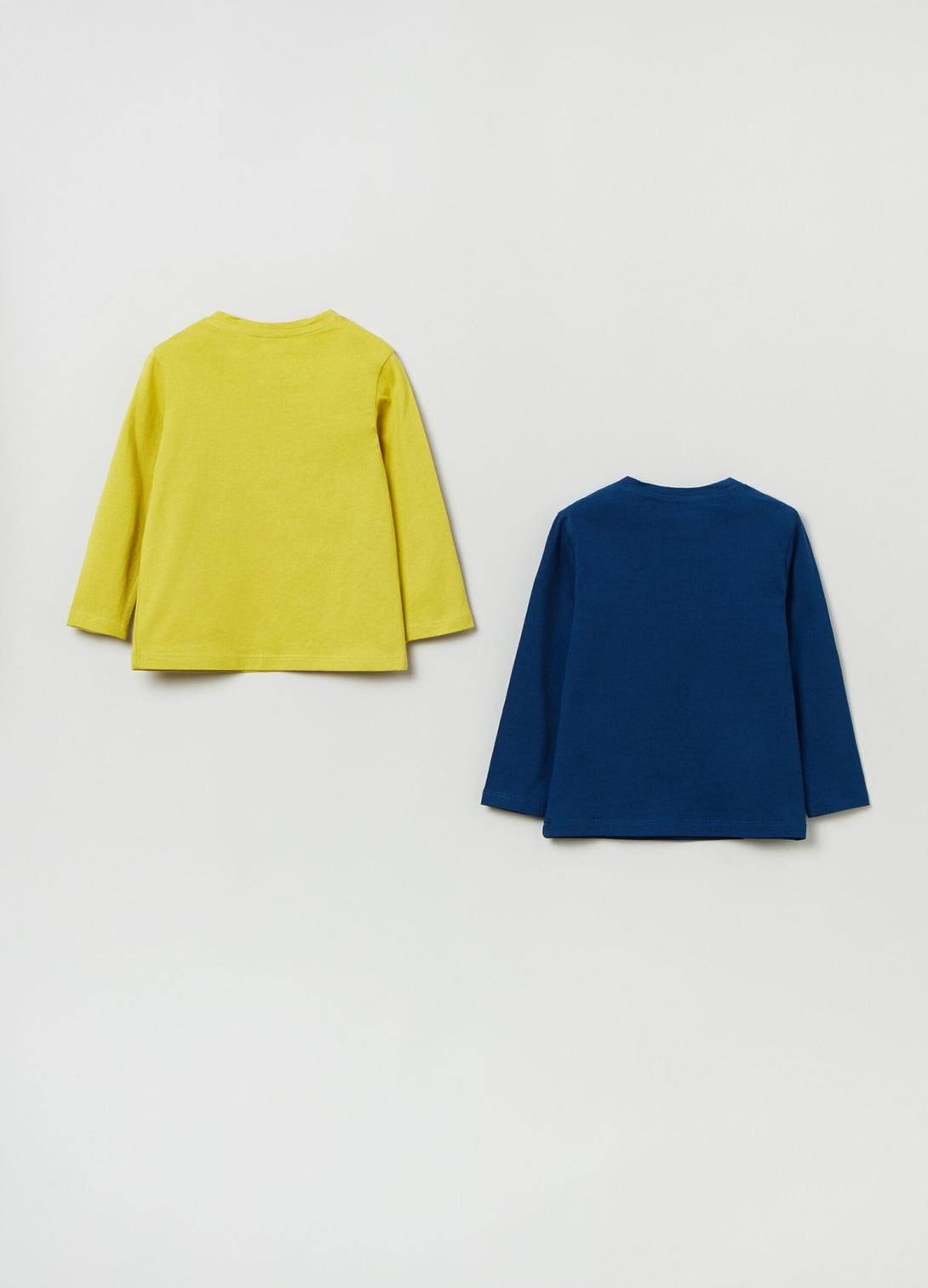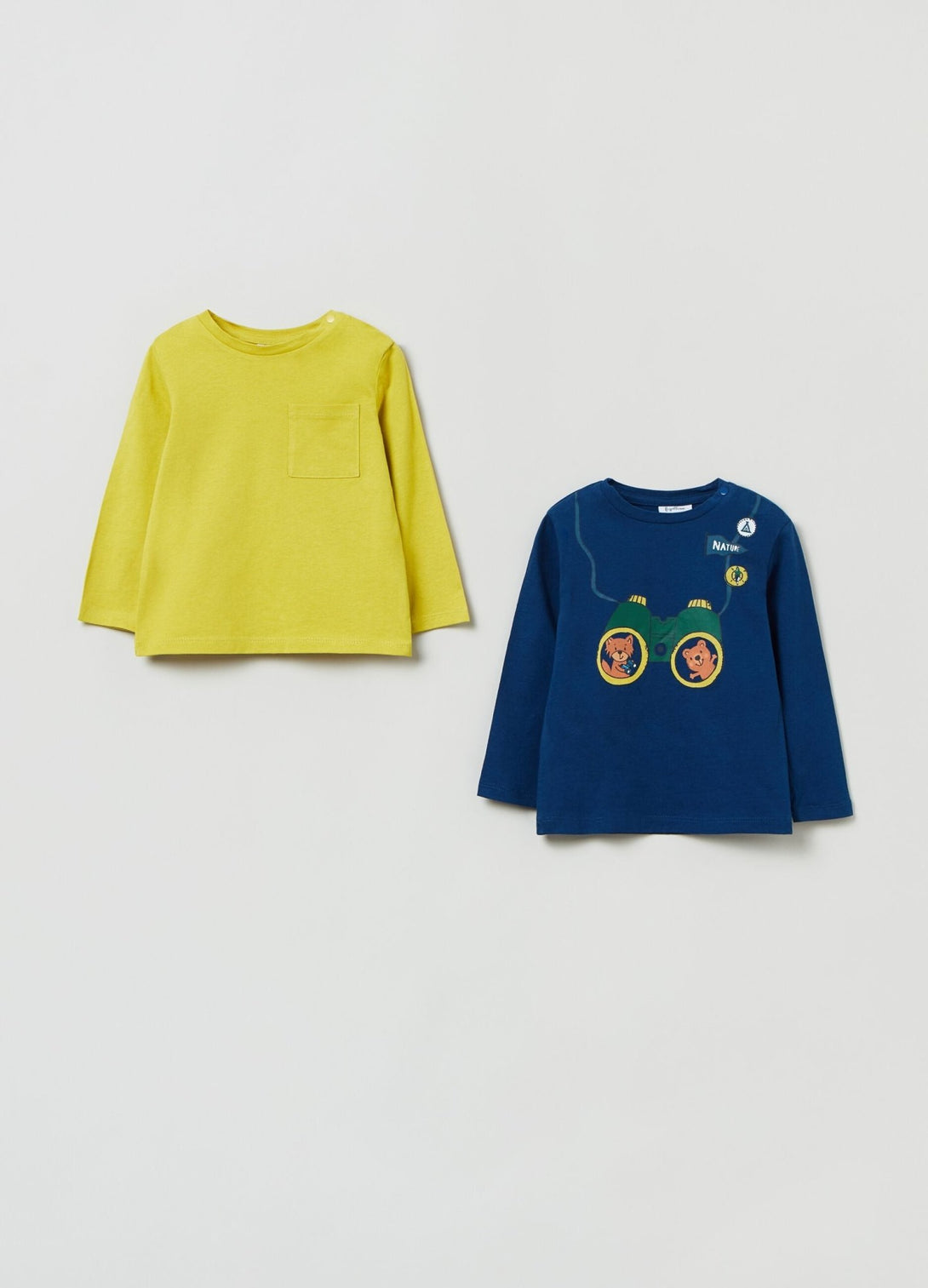 مجموعة تتكون من قميصين 100% من القطن بأكمام طويلة. رقبة مستديرة مع أزرار كبس على الكتف. تي شيرت واحد مطبوع عليه مناظير وحيوانات، وقميص واحد بلون موحد مع جيب خارجي على الصدر.