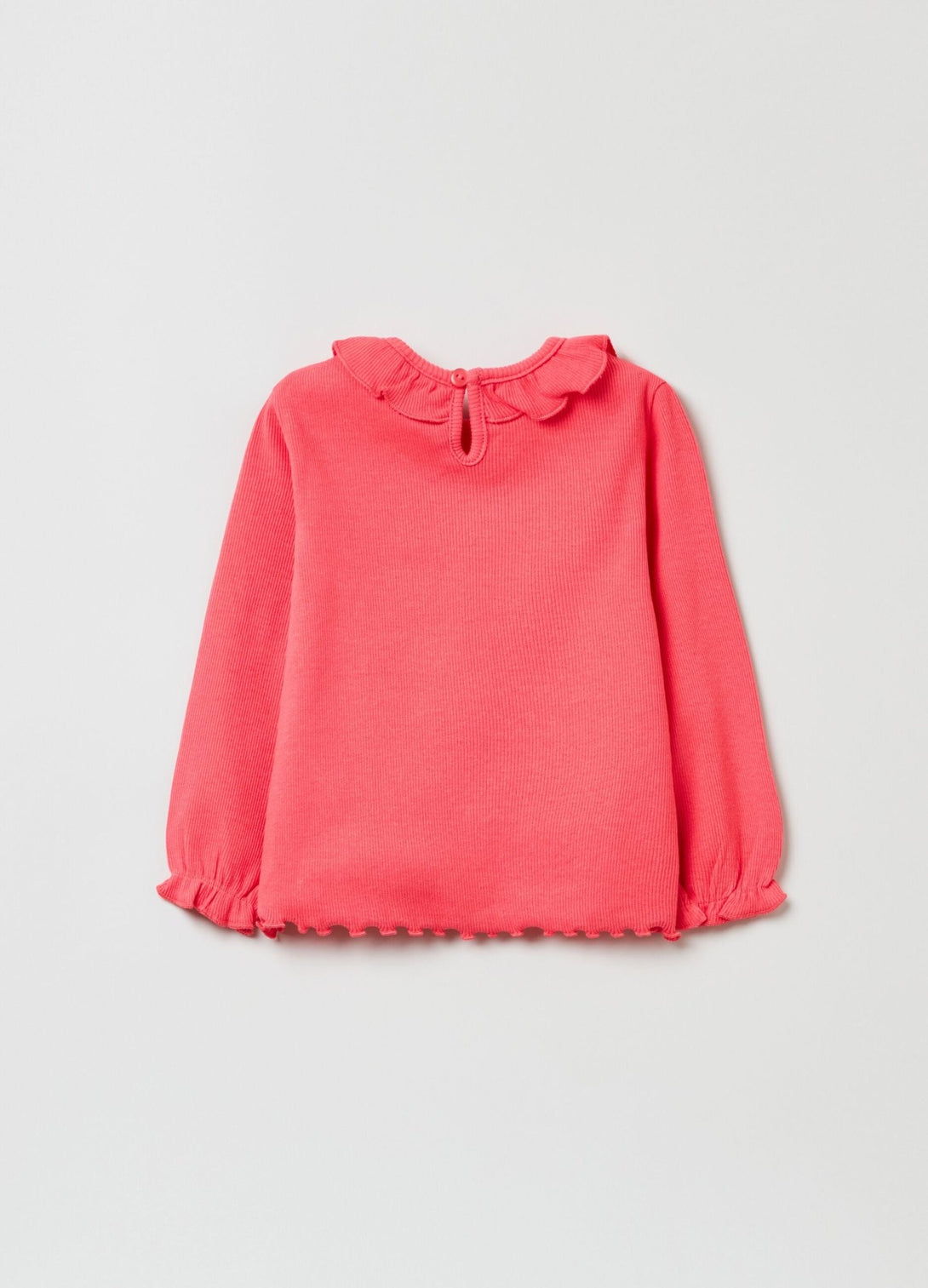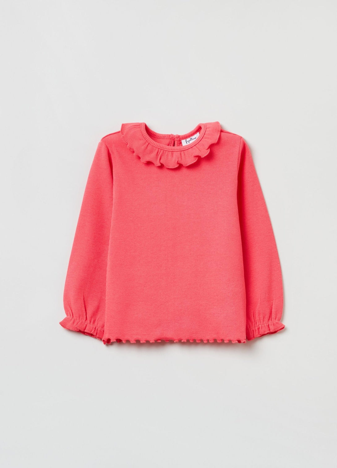 تي شيرت من القطن المطاطي المضلع بحواف مموجة. أكمام طويلة منفوخة. رقبة مستديرة مع كشكش. فتحة المفتاح مع زر للإغلاق في الخلف.