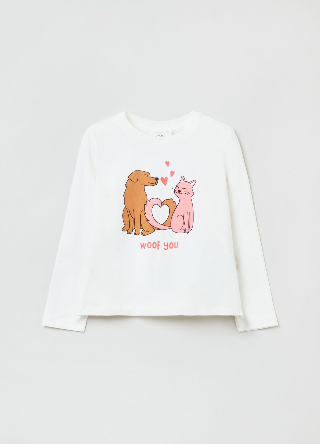 تي شيرت بأكمام طويلة من القطن بنسبة 100%. رقبة دائرية مضلعة. طبعة على شكل جرو وقطة مغرمة بقلوب وحروف لامعة.