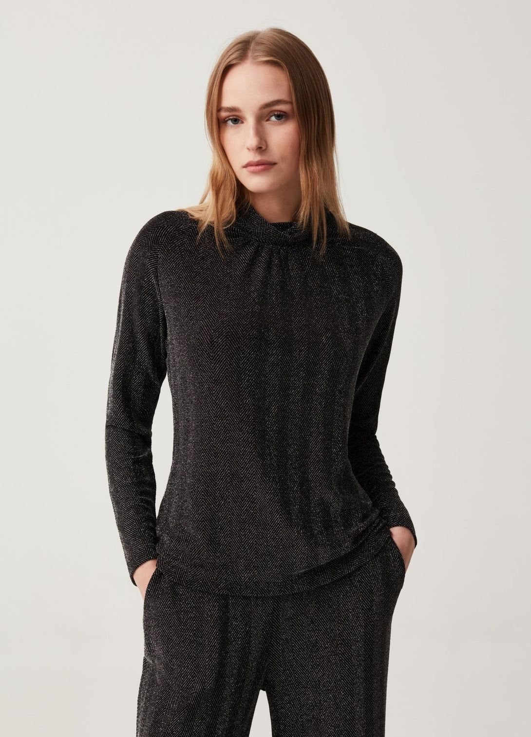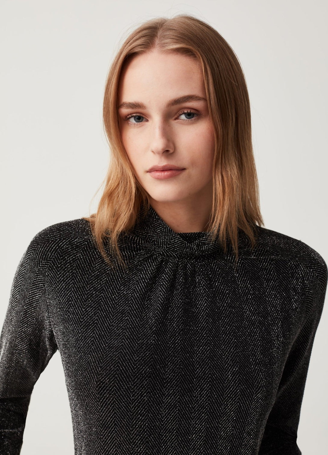 Stretch fabric T-shirt with lurex Herringbone weave. High neck with pleating on the front. Long raglan sleeves. Teardrop opening on back.