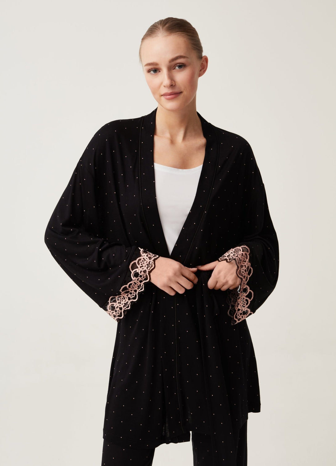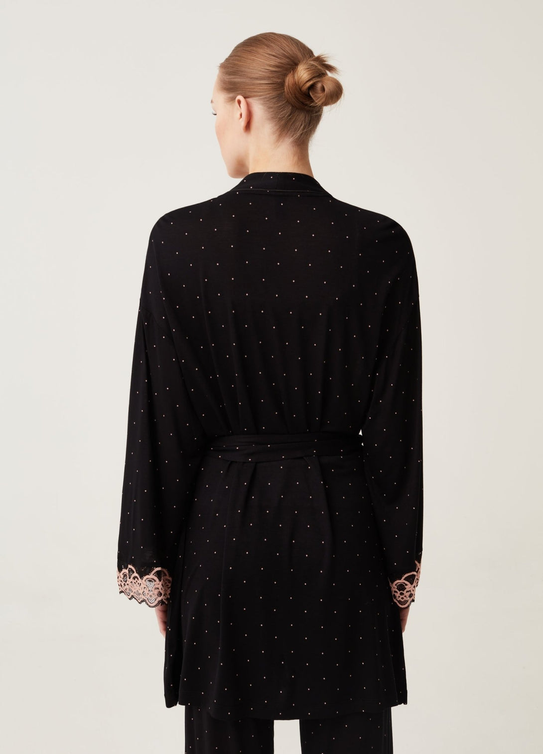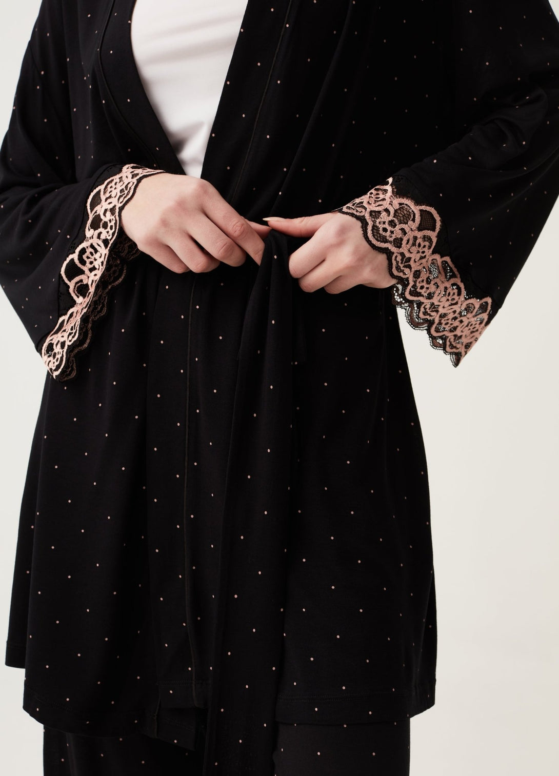 Short robe in 100% viscose with polka dot pattern. Long kimono sleeves with drop shoulders and lace trim. Knotted waist belt.