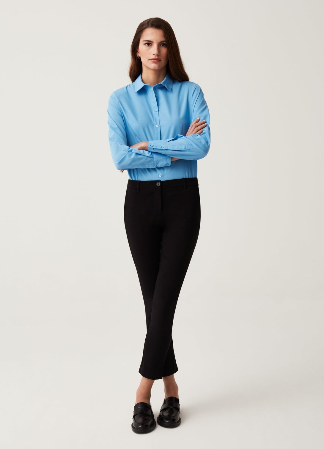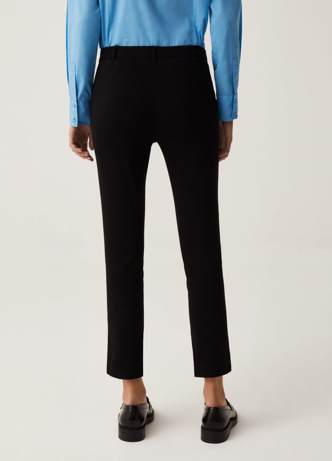 Solid colour slim-fit, chino trousers in stretch viscose blend. Ankle-grazer length. Two vertical pockets. Zip and button fastening.