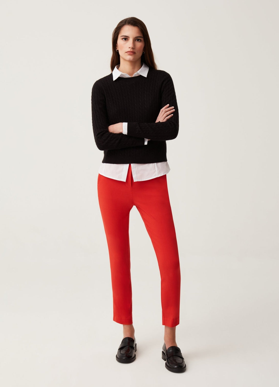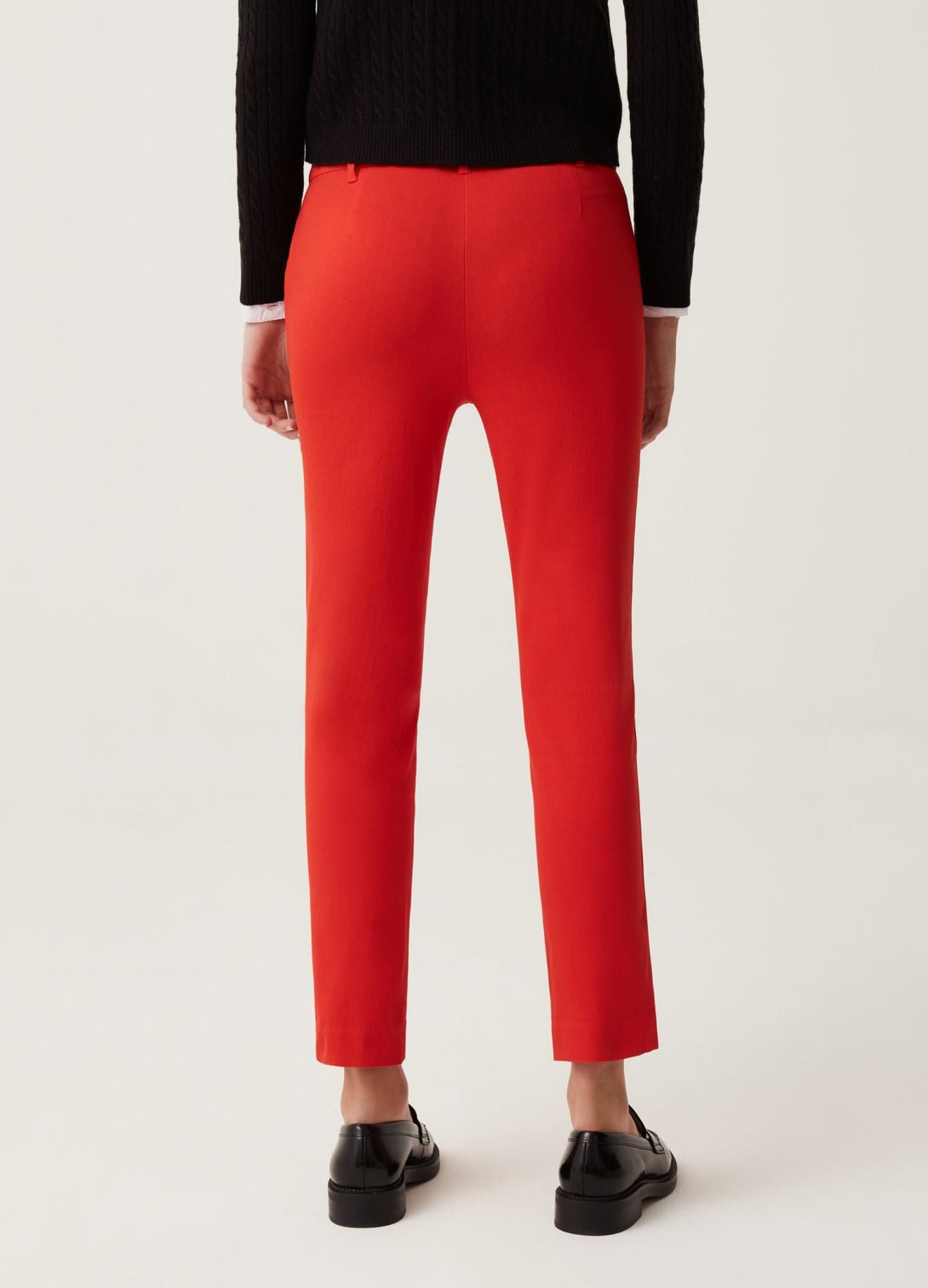 Solid colour slim-fit, chino trousers in stretch viscose blend. Ankle-grazer length. Two vertical pockets. Zip and button fastening.