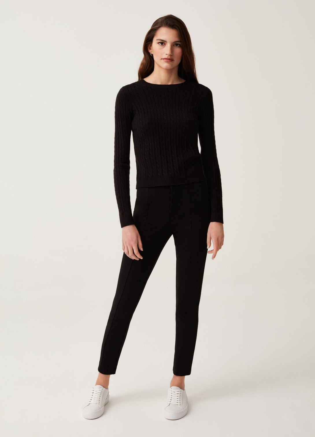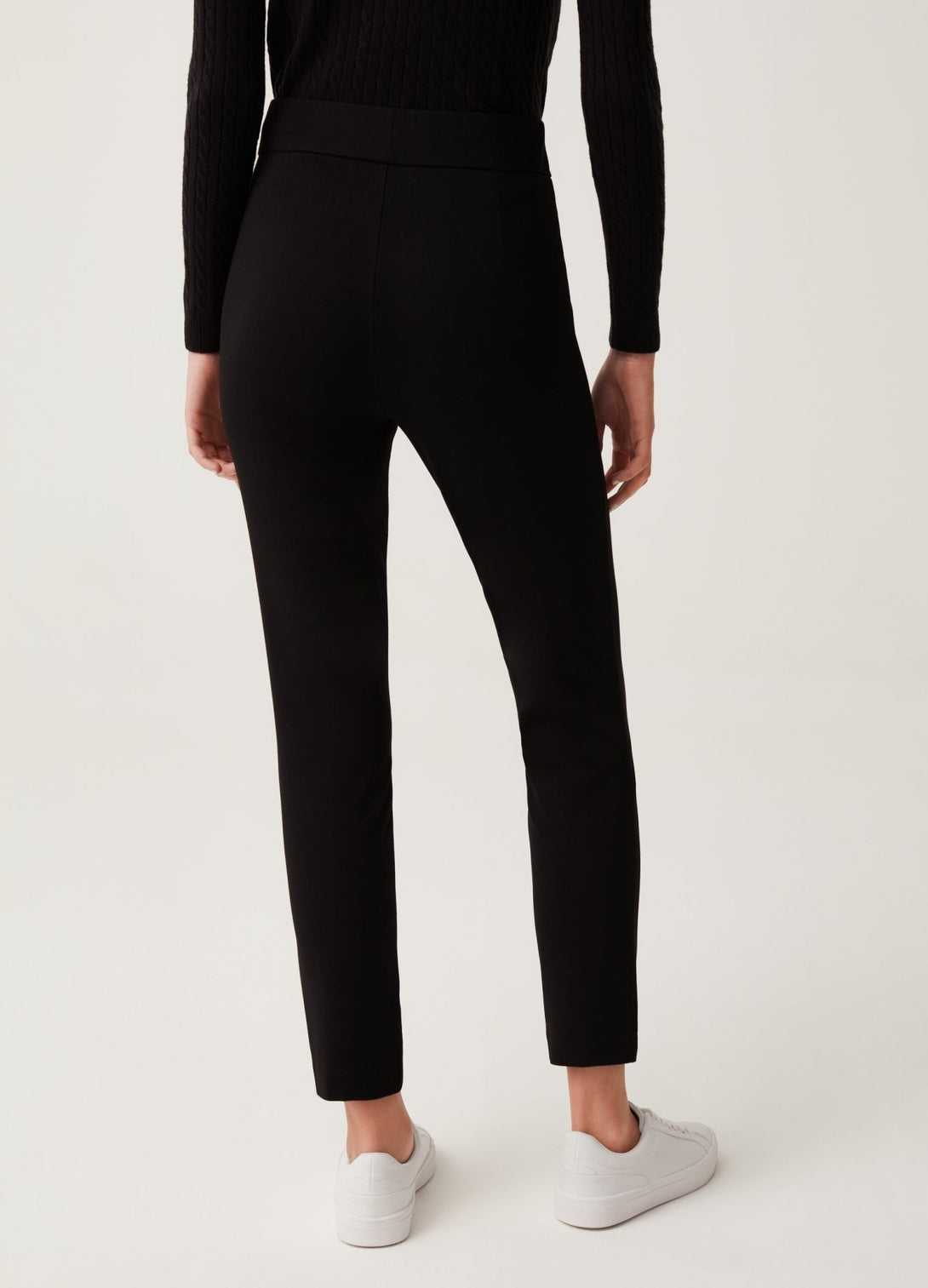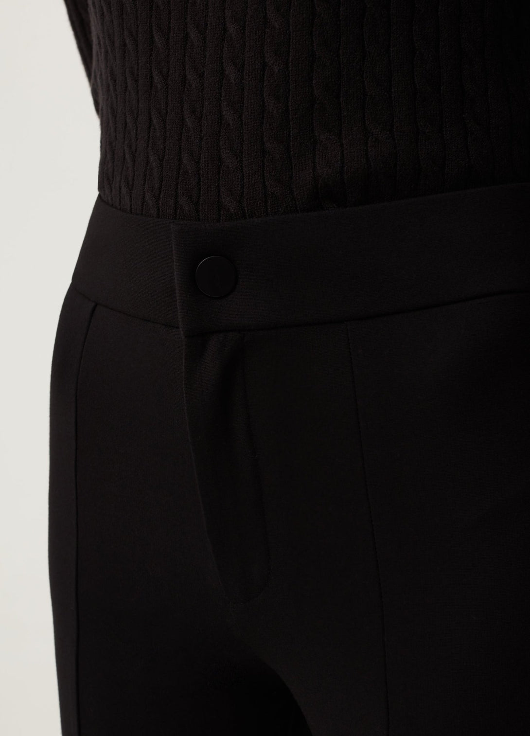 Stretch viscose blend fabric leggings with embossed seams. Elasticated waistband with button.