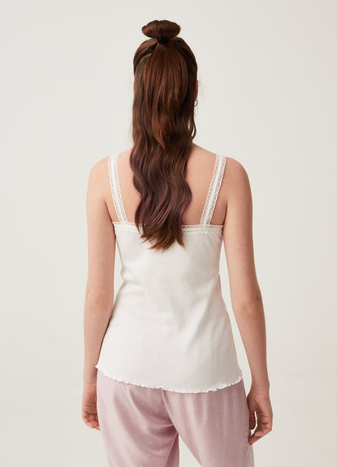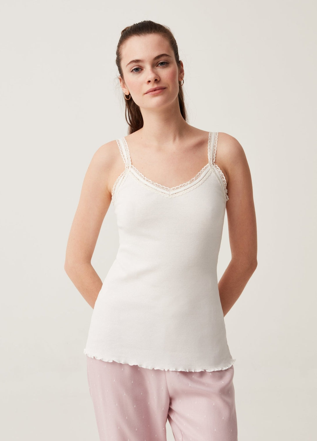 100% cotton ribbed vest with lace trim. Spaghetti straps. V neck. Hem with scalloped trim.