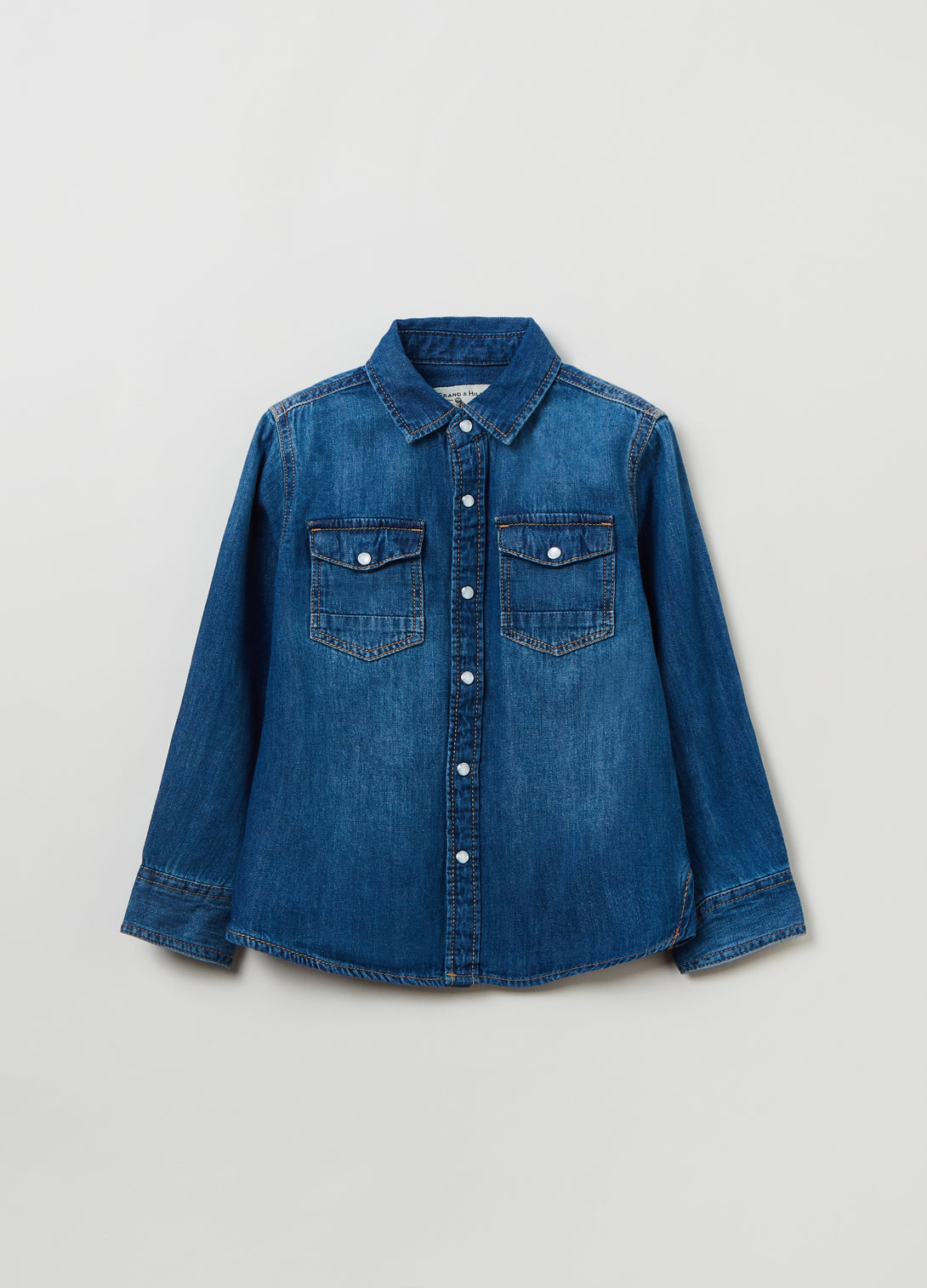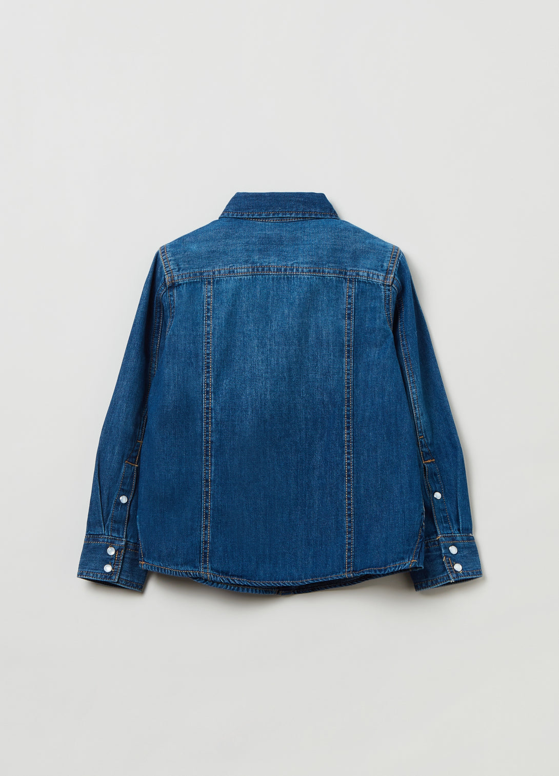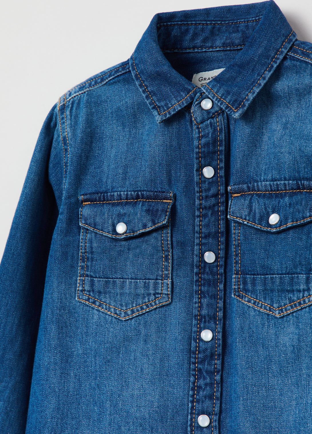 Grand&Hills 100% cotton denim shirt. Bluff collar and yoke on the back. Two pockets with flap and button on the chest. Snap button fastening with mother-of-pearl-effect finish.