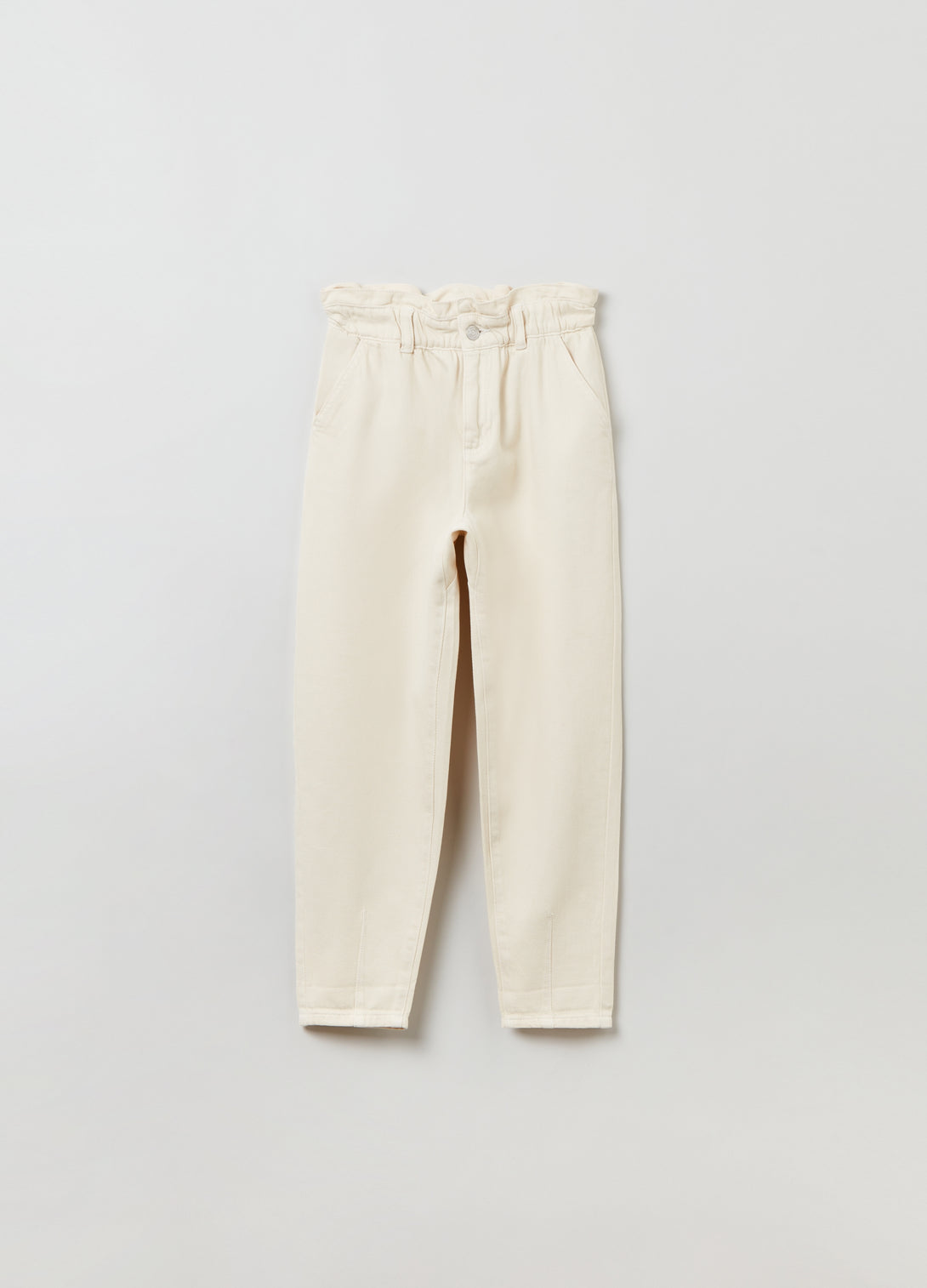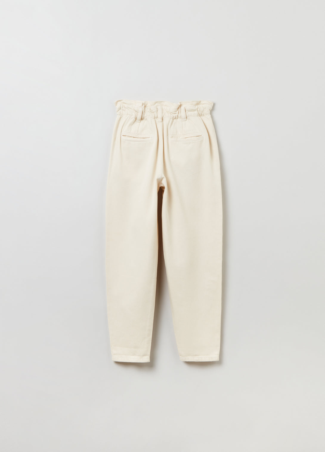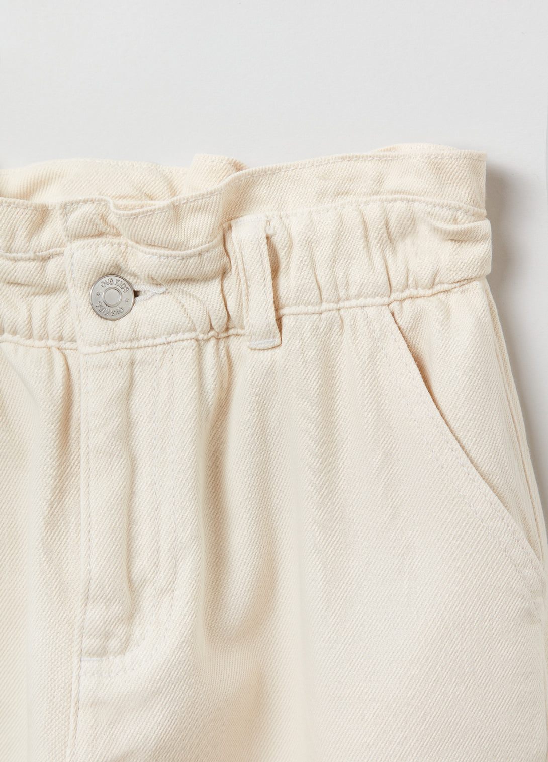 Paper bag jeans in 100% cotton twill. Elasticated waist. Two slant pockets and two welt pockets on the back. Zip and button fastening.