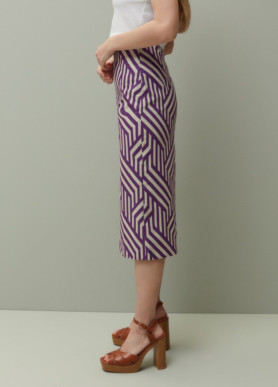 PIOMBO twill pencil skirt in 100% cotton All-over geometric print. High waist. Back split. Side zip fastening.