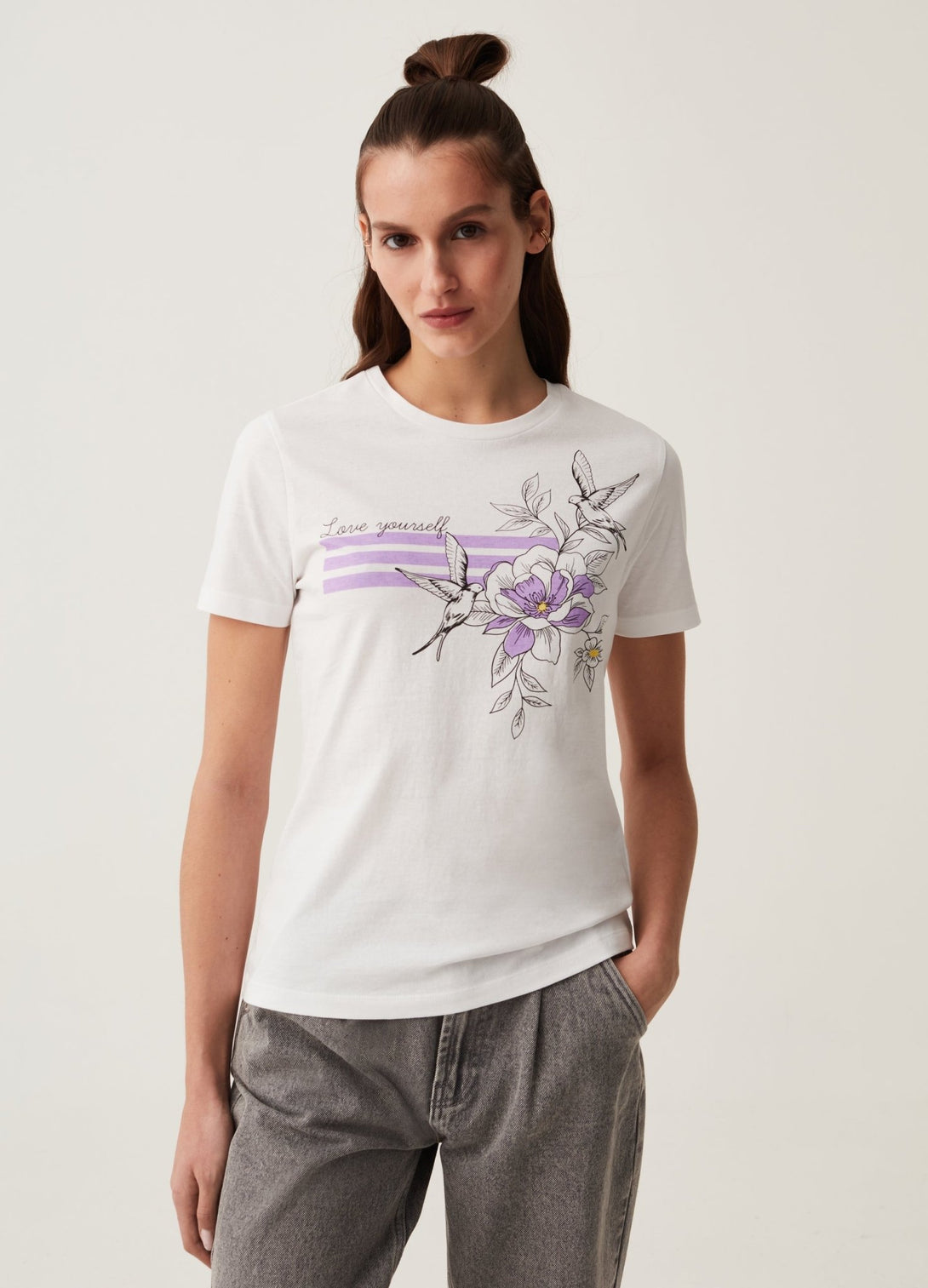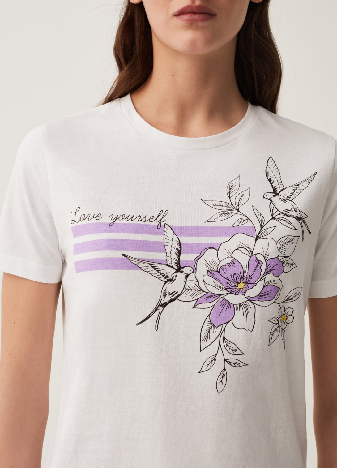 Round-neck T-shirt in 100% cotton. Flower and swallows print and lettering on front.