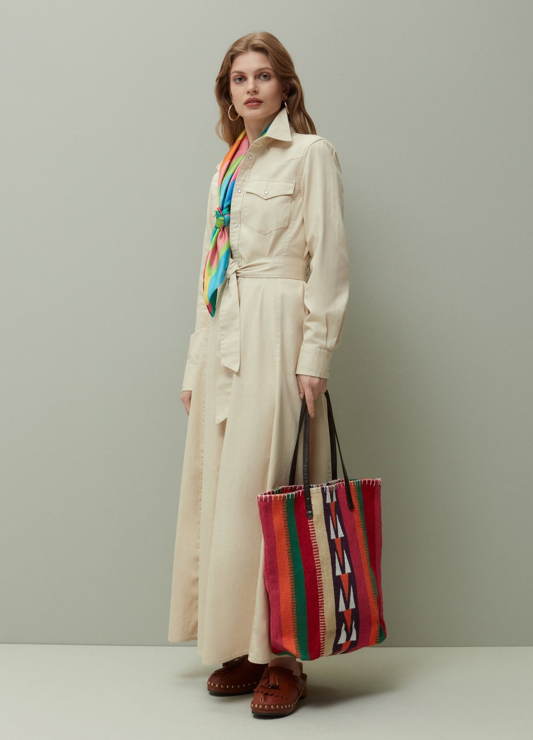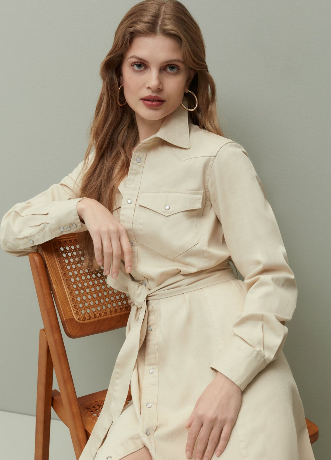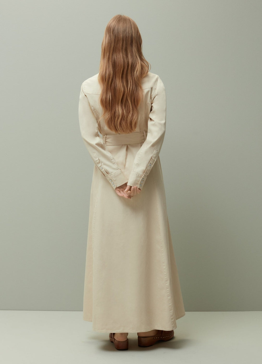 PIOMBO long shirt dress in 100% cotton denim. Yoke on front and back. Sleeves with buttons. Two patch pockets with flaps on the chest. Knotted belt fastening and snap buttons with mother-of-pearl effect.