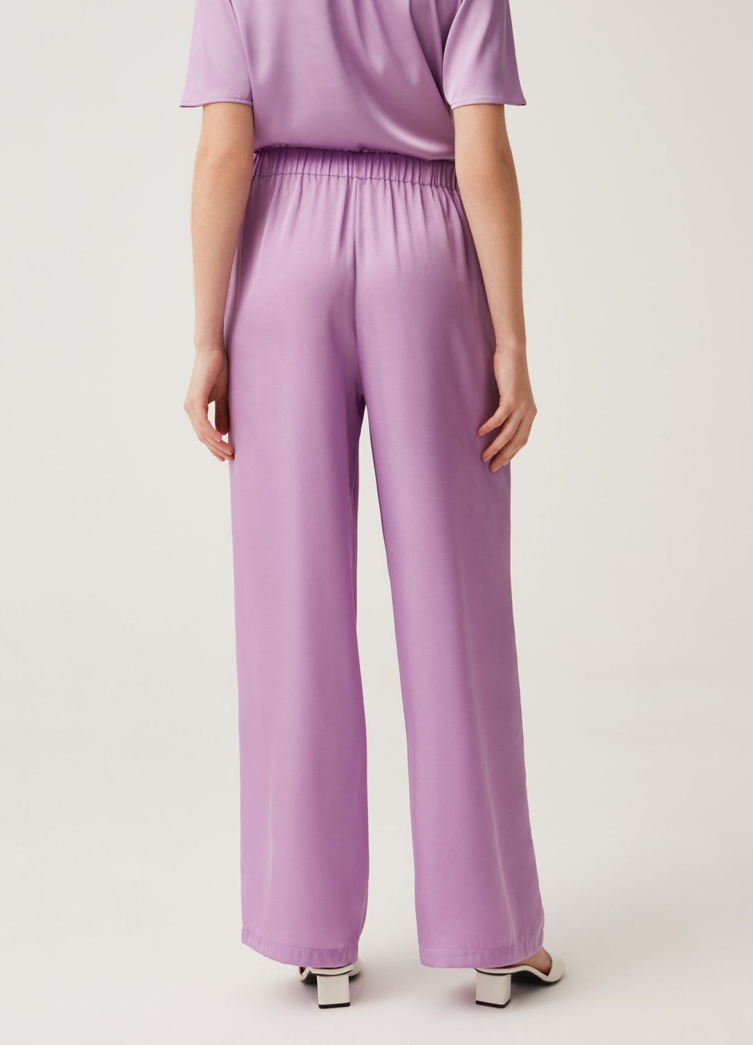 Solid colour stretch satin palazzo pants. High rise. Two vertical pockets. Side zip fastening.