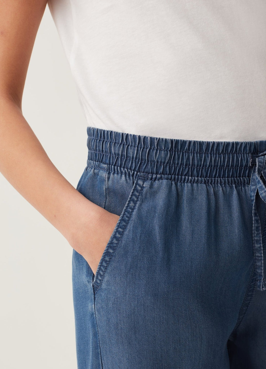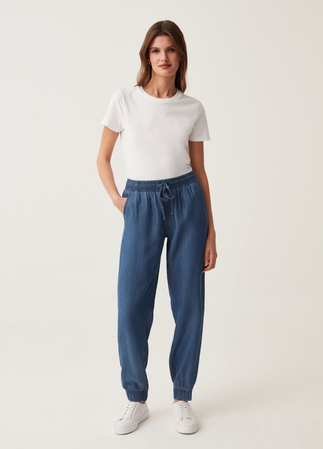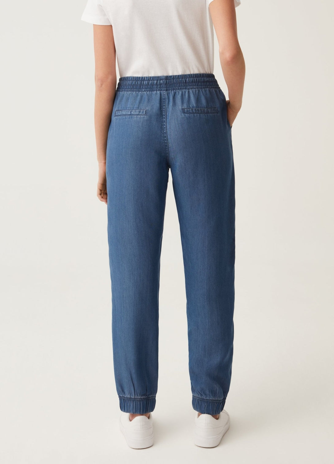 Denim-effect joggers in 100% Lyocell with drawstring. Two slant pockets and two welt pockets on the back. Elasticated ankles.