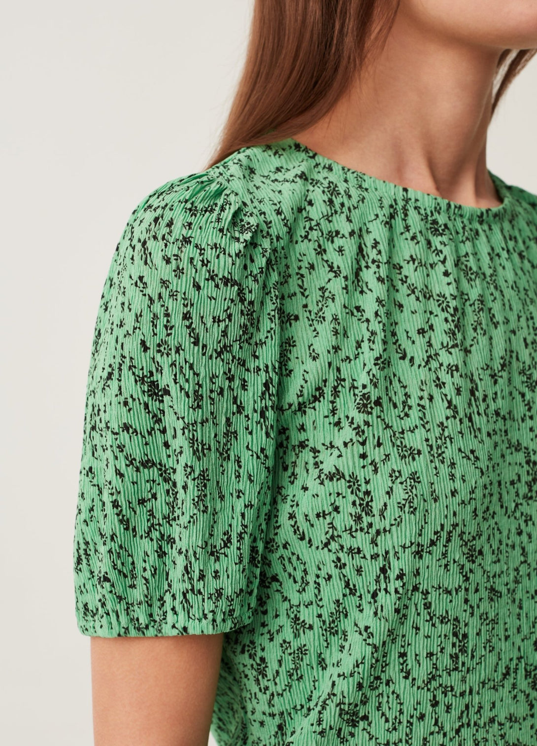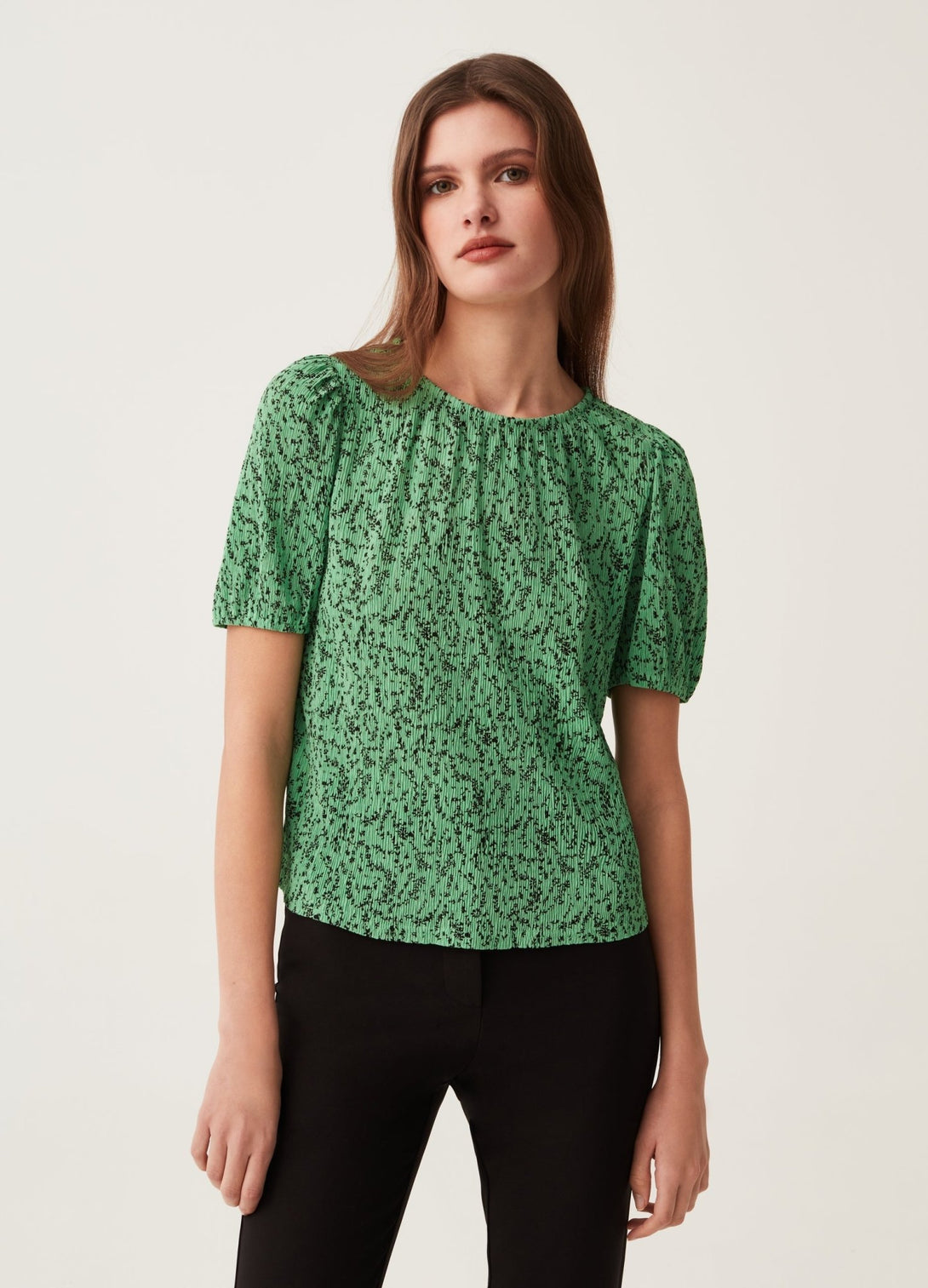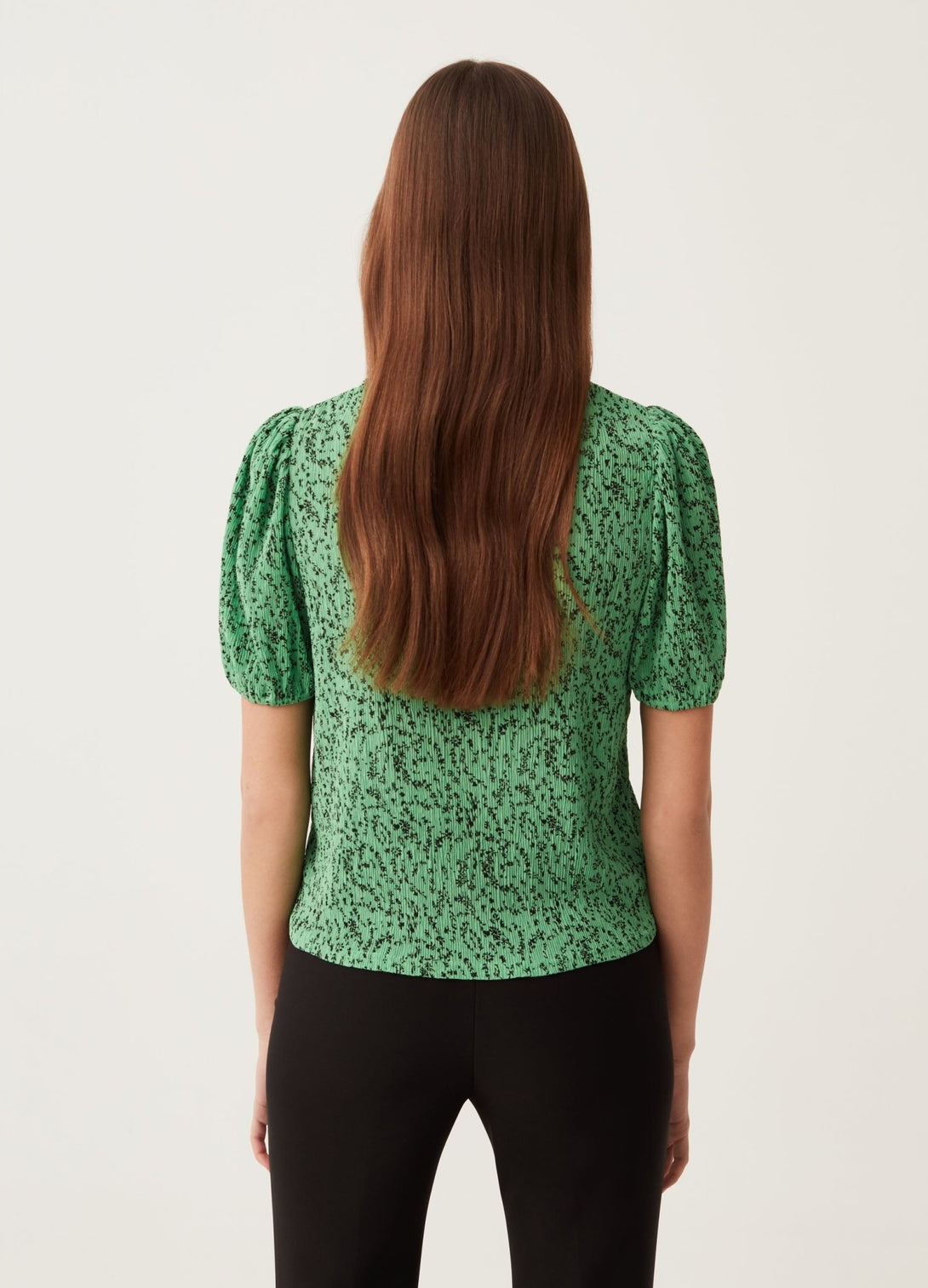 Crêpe T-shirt with micro floral print. Round neck. Puff sleeves.