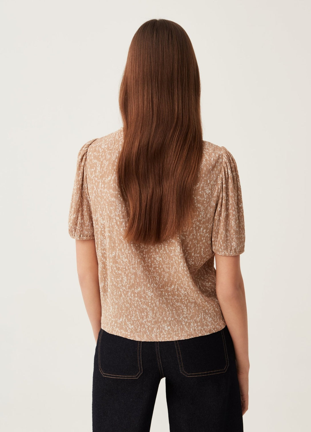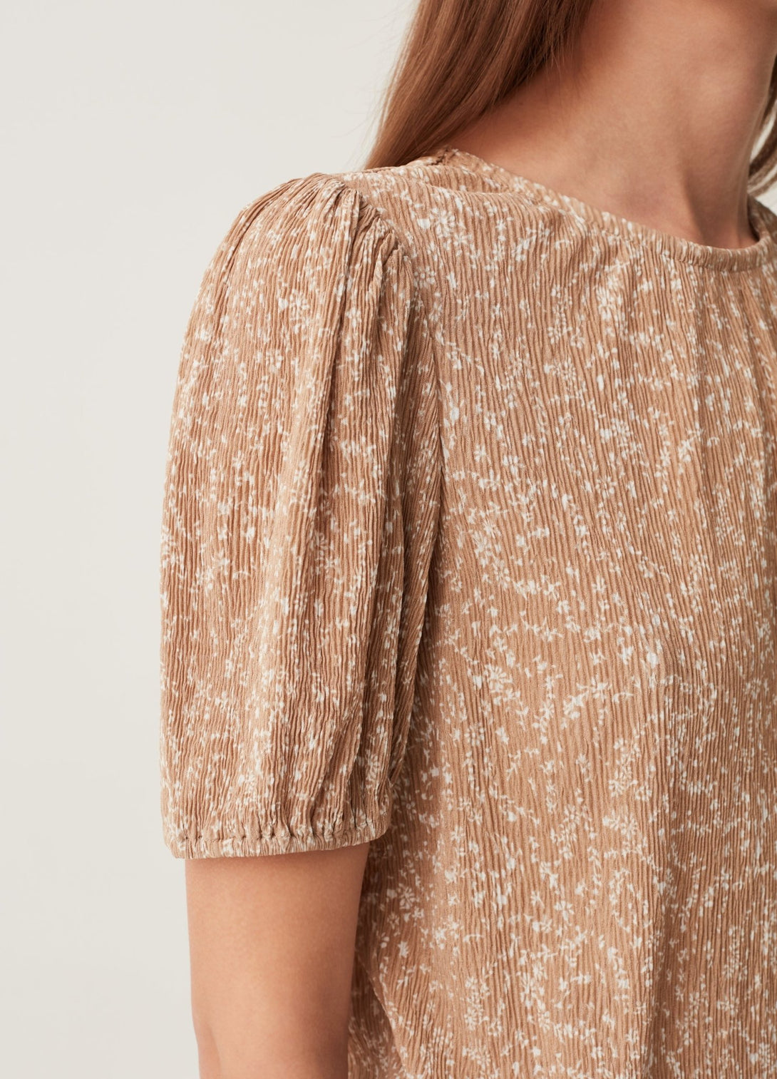 Crêpe T-shirt with micro floral print. Round neck. Puff sleeves.