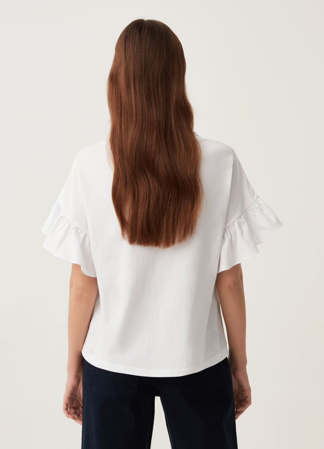 100% cotton T-shirt with floral embroidery on the front. Round neck. Kimono sleeves with ruffled cuffs.