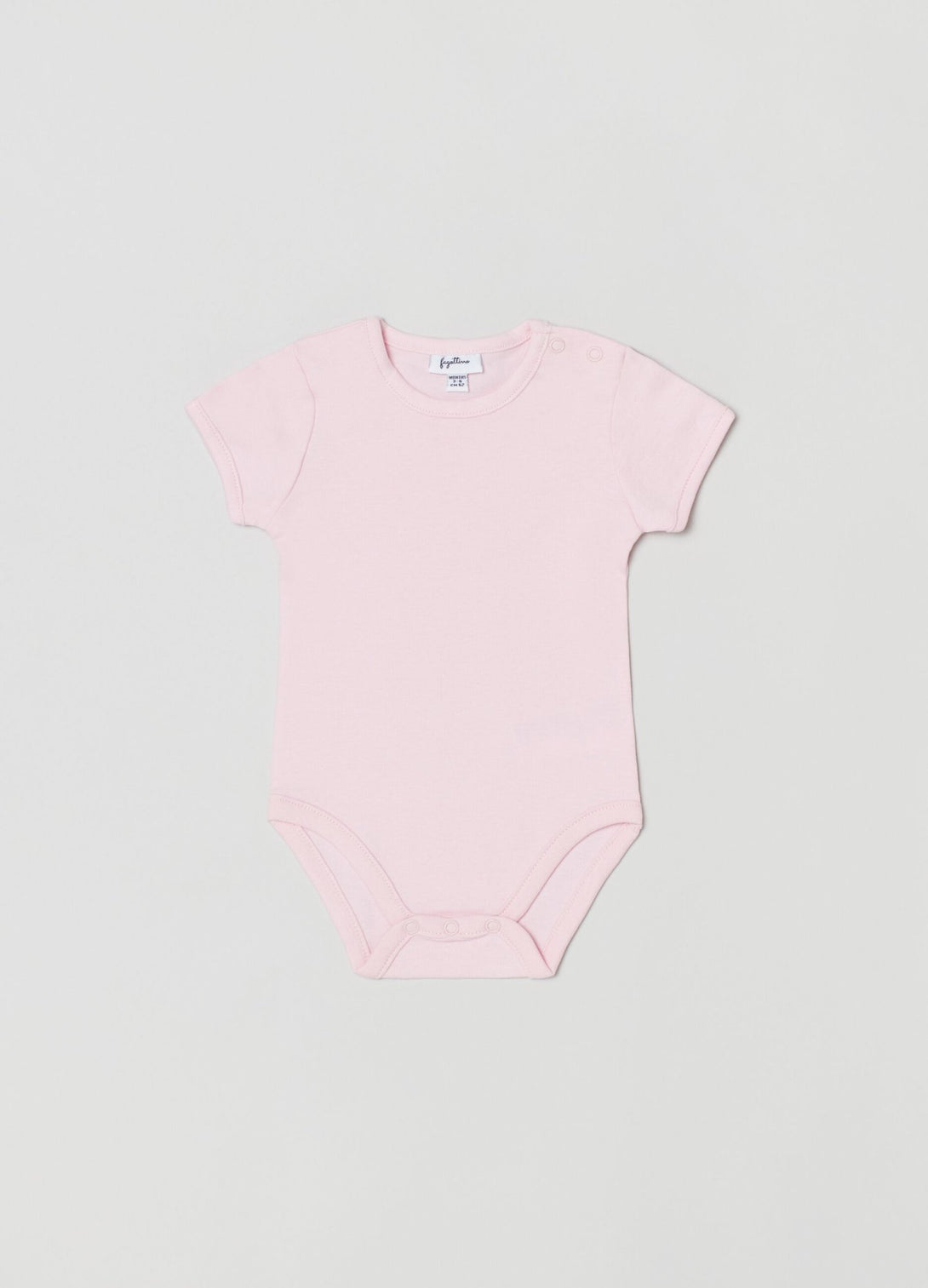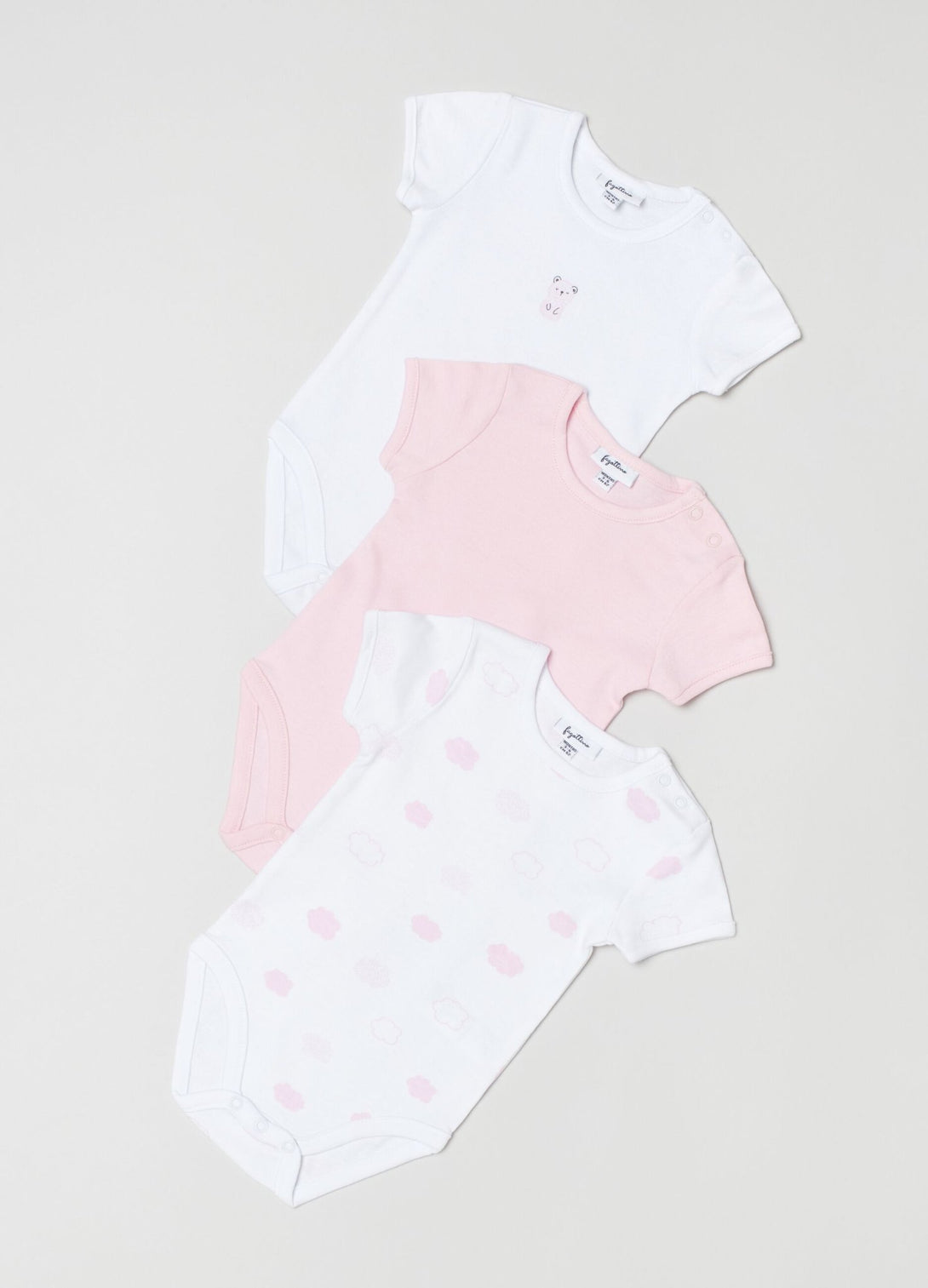 Set of three short-sleeved bodysuits in 100% cotton. Round neck. Press-stud fastening on shoulder and gusset. One solid colour bodysuit and one bodysuit with clouds print.