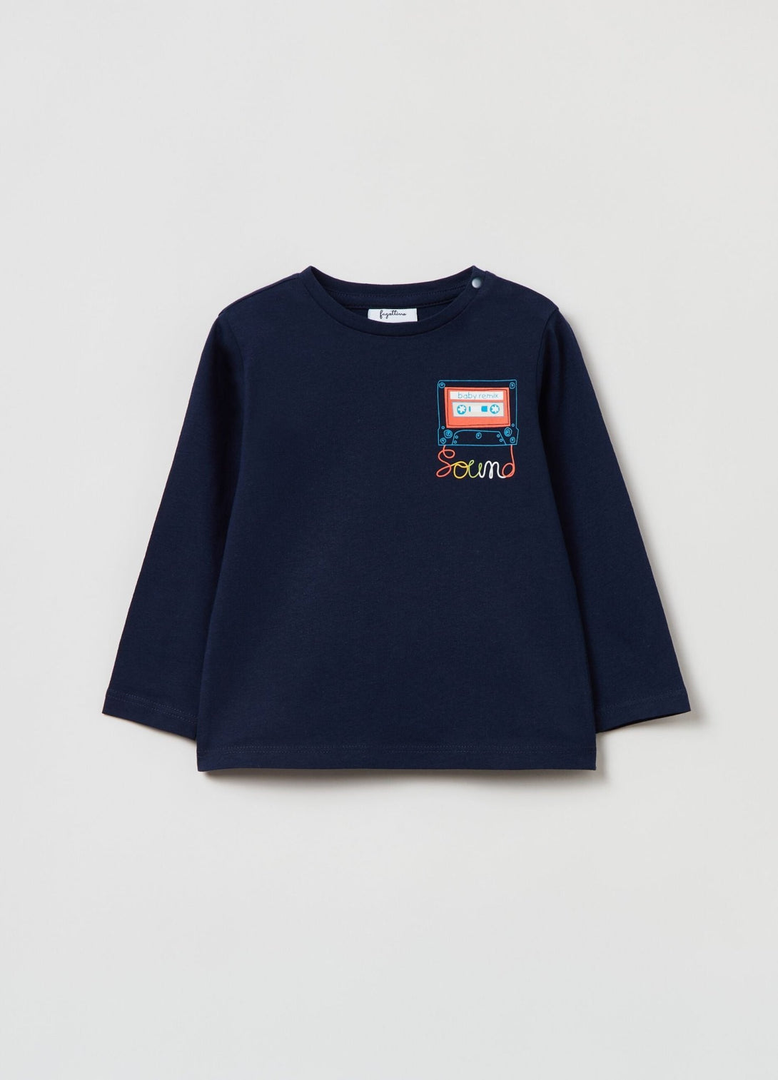 100% cotton T-shirt with long sleeves. Round neck with snap buttons on the shoulder. Stereo and lettering print on the front.