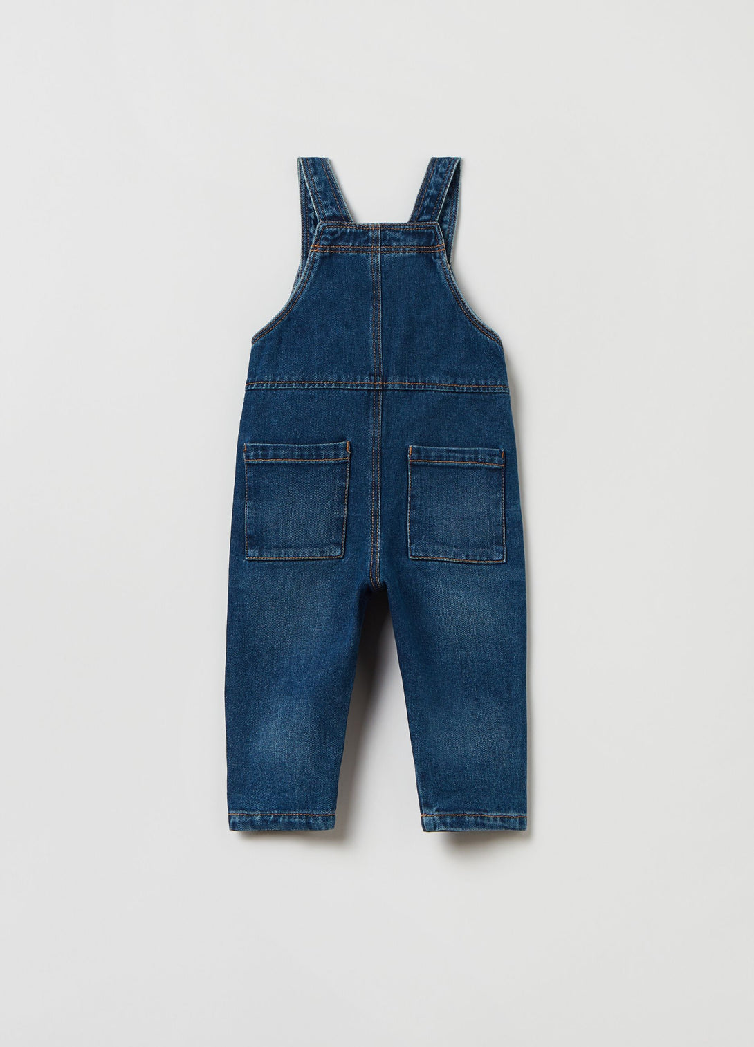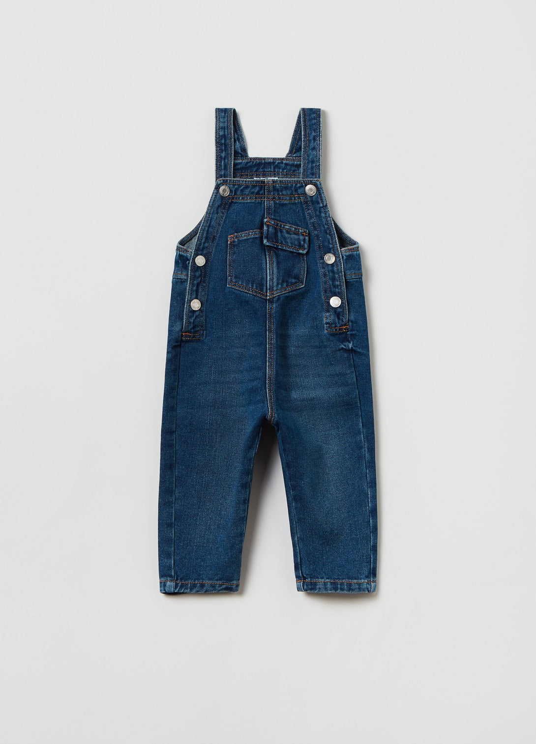 Dungarees in 100% cotton denim. Braces with snap button. Double patch pocket on the chest and two patch pockets on the back. Fastening with metallic buttons on the front.