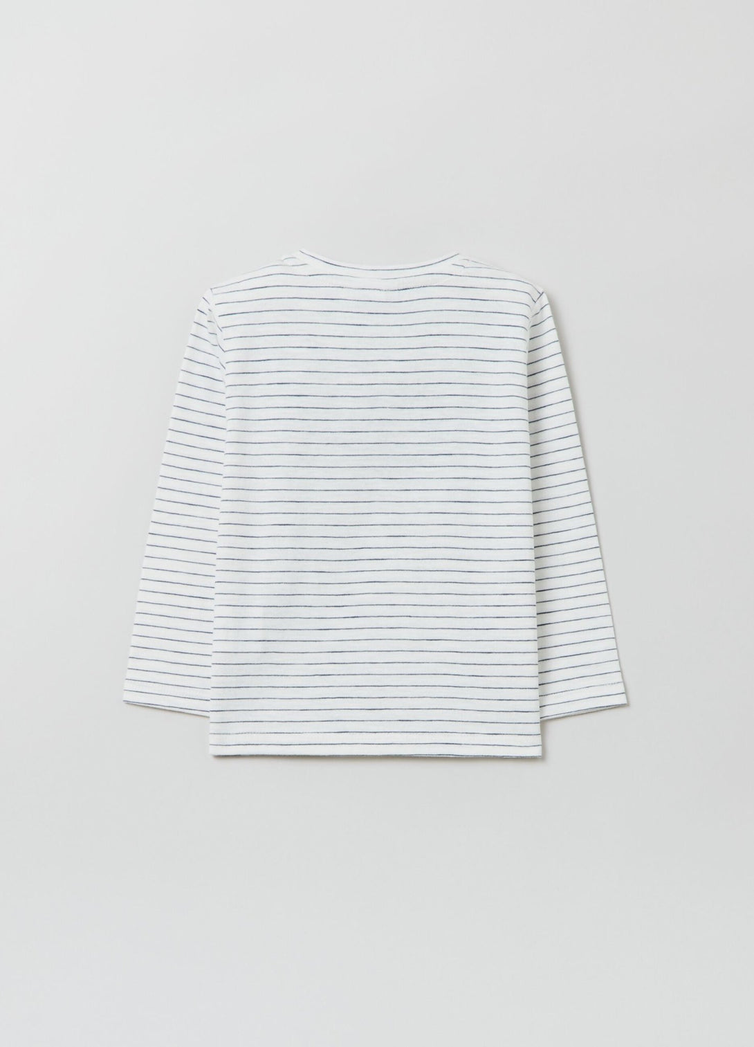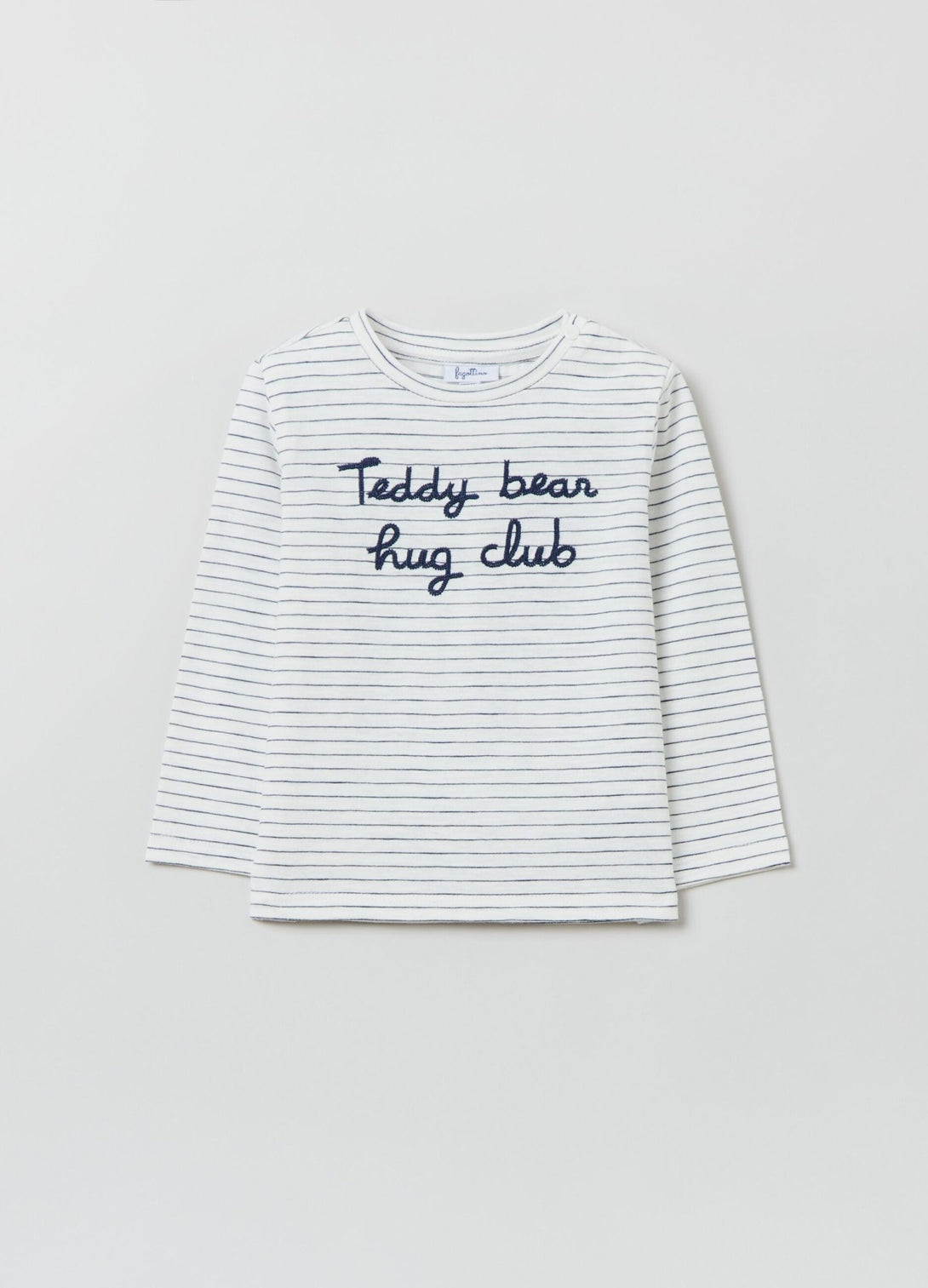 100% cotton T-shirt with long sleeves. Round neck. Striped pattern with embroidered lettering on the chest. Snap button fastening on the shoulder.