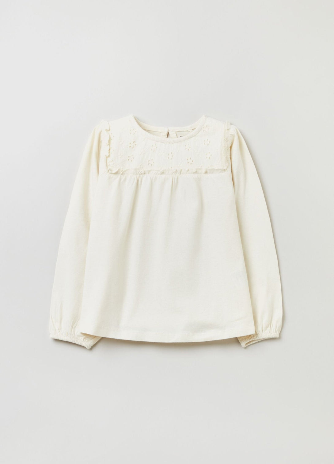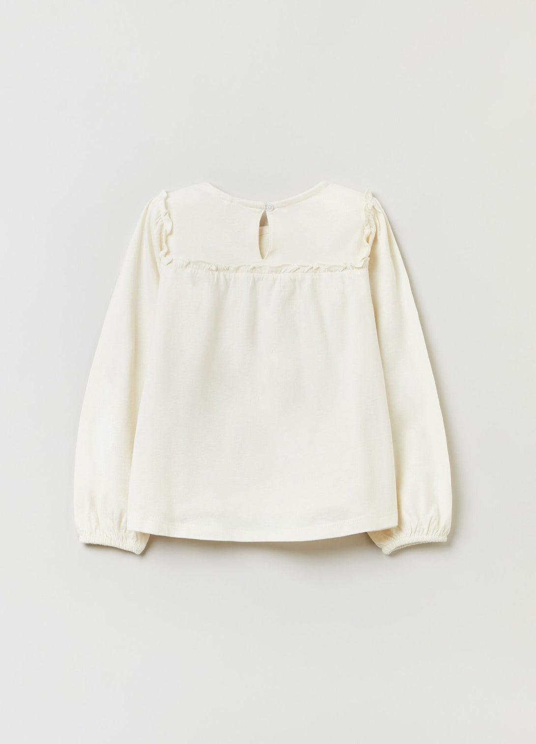 100% cotton T-shirt with crew-neck. Yoke, front and back, with ruffled trim and broderie anglaise insert on the front. Long puffed sleeves with elasticated cuffs. Keyhole opening with button fastening on the back.