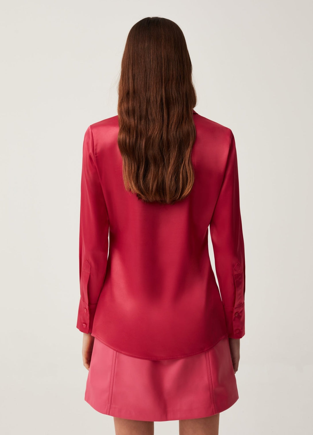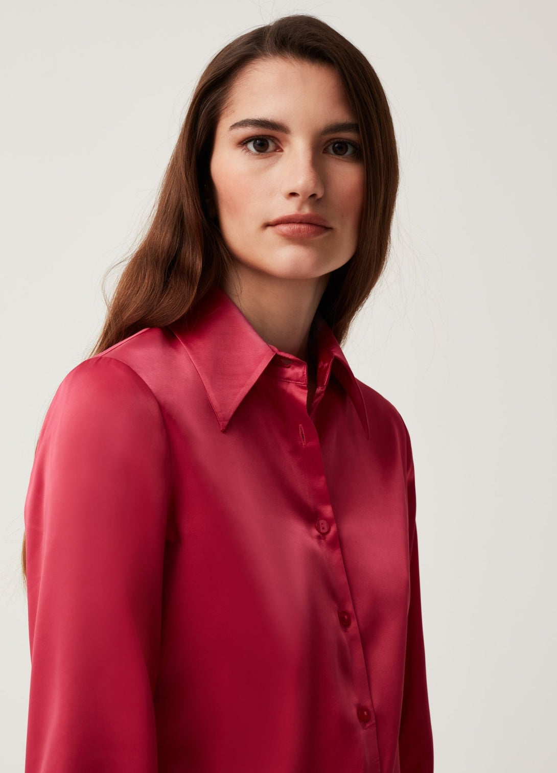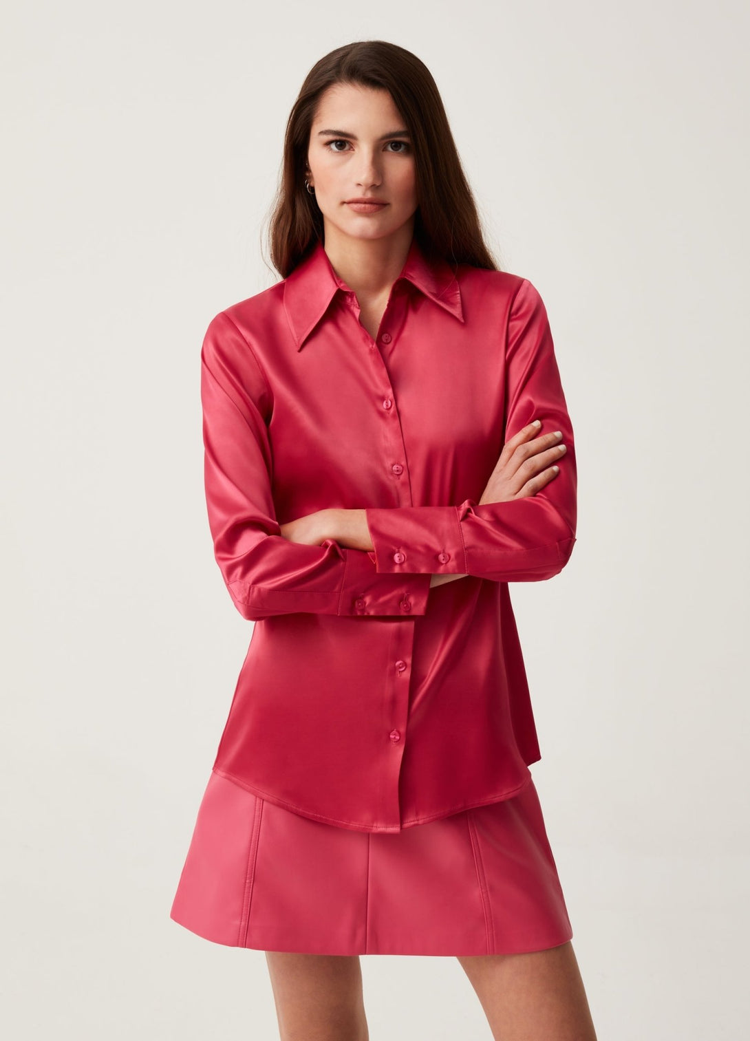 Solid colour stretch satin shirt. Bluff collar. Button fastening.