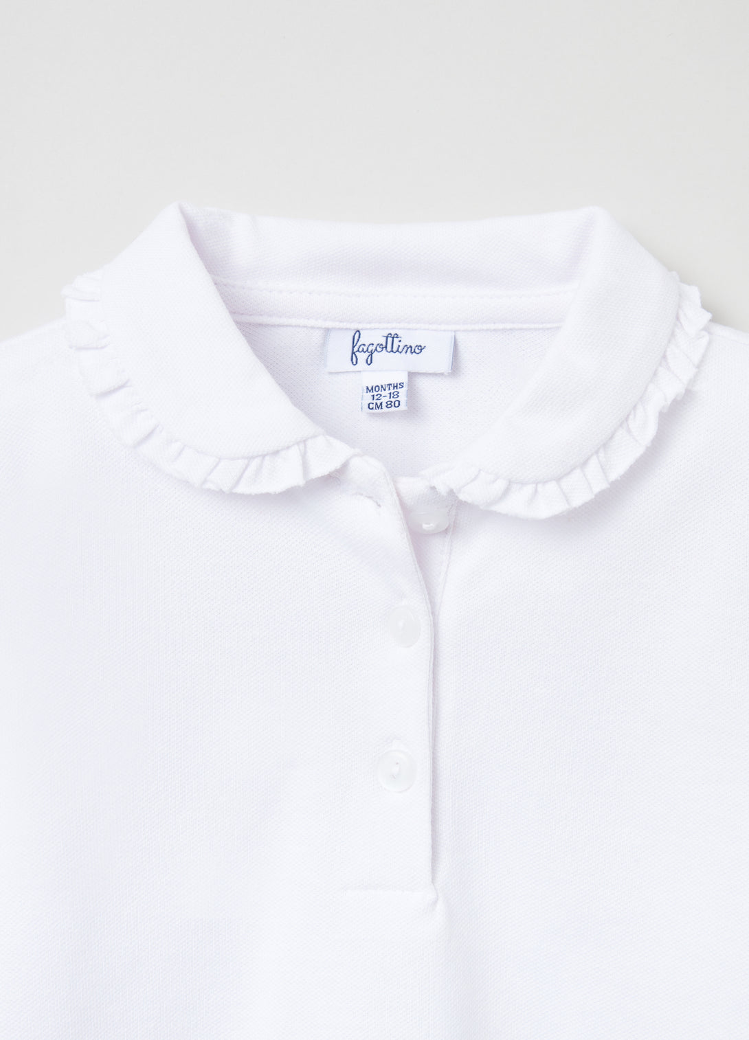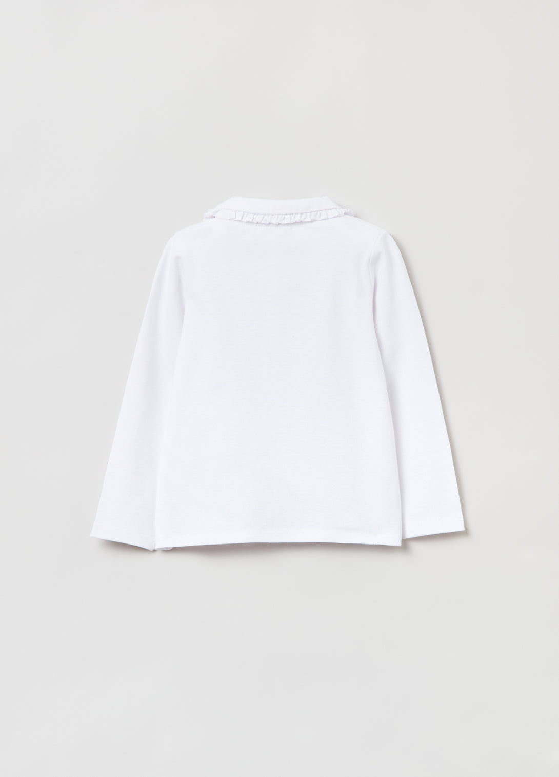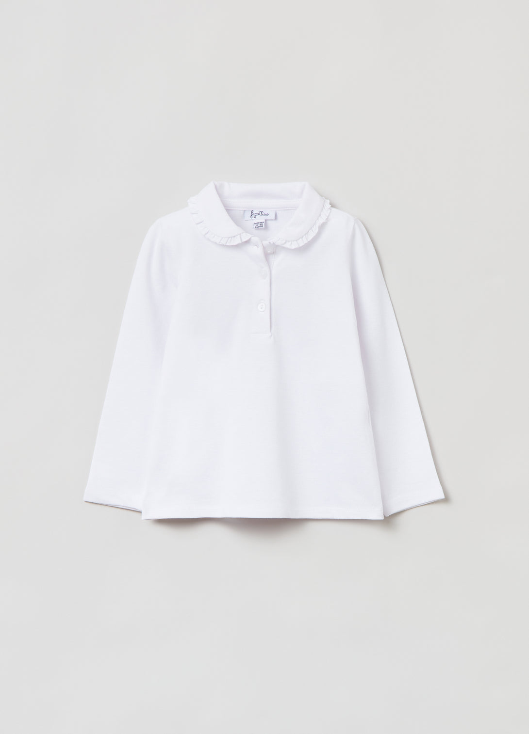 Long-sleeve polo shirt in stretch cotton pique. Collar with ruffle trim. Matching button fastening.