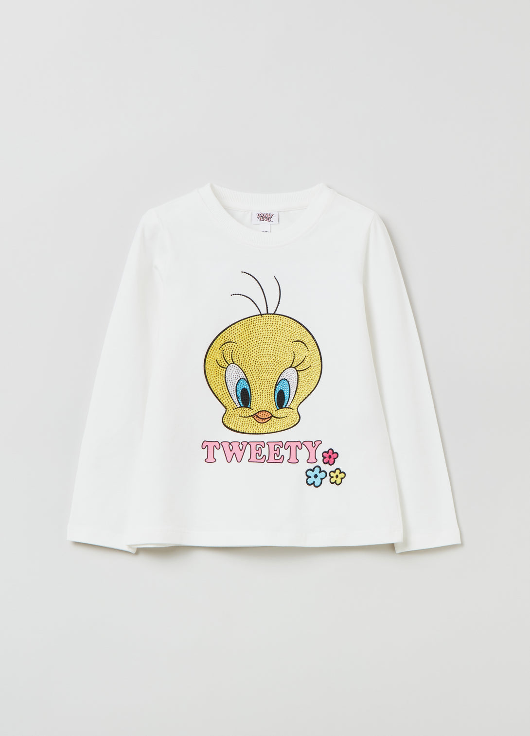 Long-sleeved T-shirt in stretch cotton. Round ribbed neck. Looney Tunes Tweety print with diamantés and lettering. Embroidered flowers.
