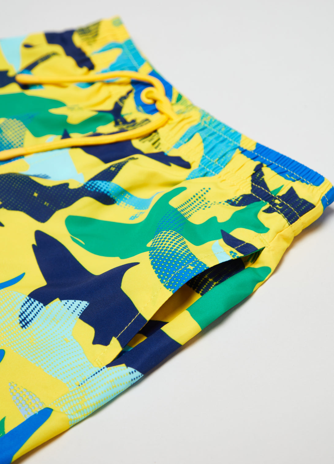 Swimming trunks with all-over sharks print. Drawstring waist. Two vertical pockets.