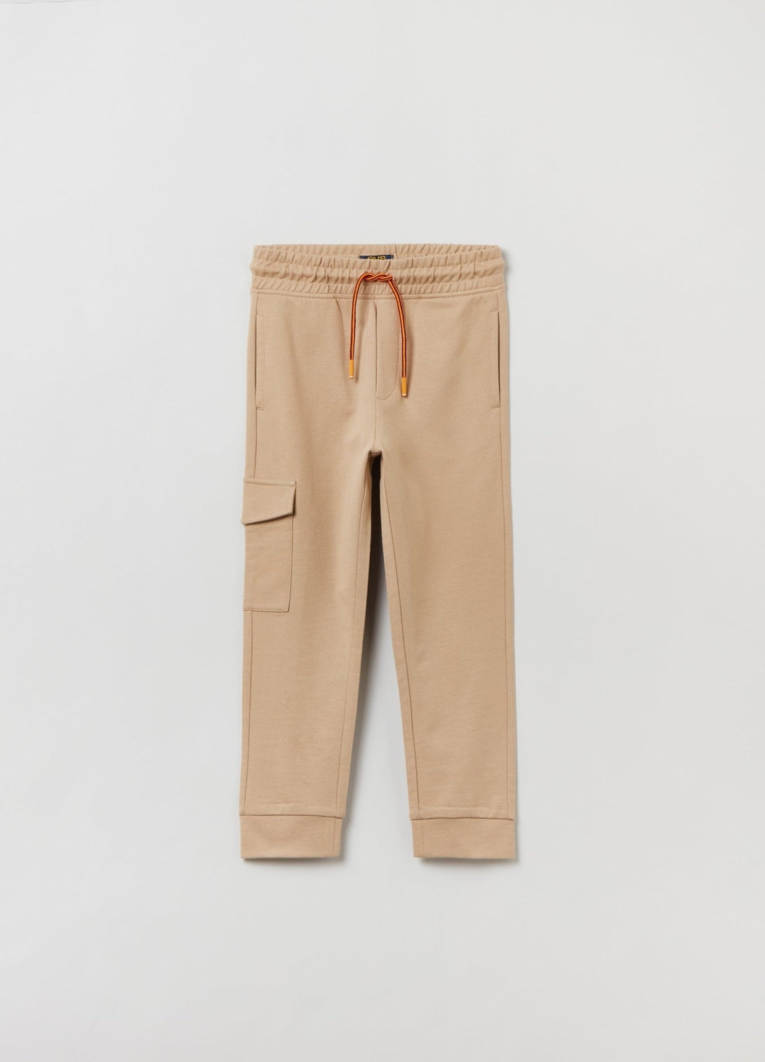 100% cotton plush joggers with two-tone drawstring. Two vertical pockets and one side pocket with flap.