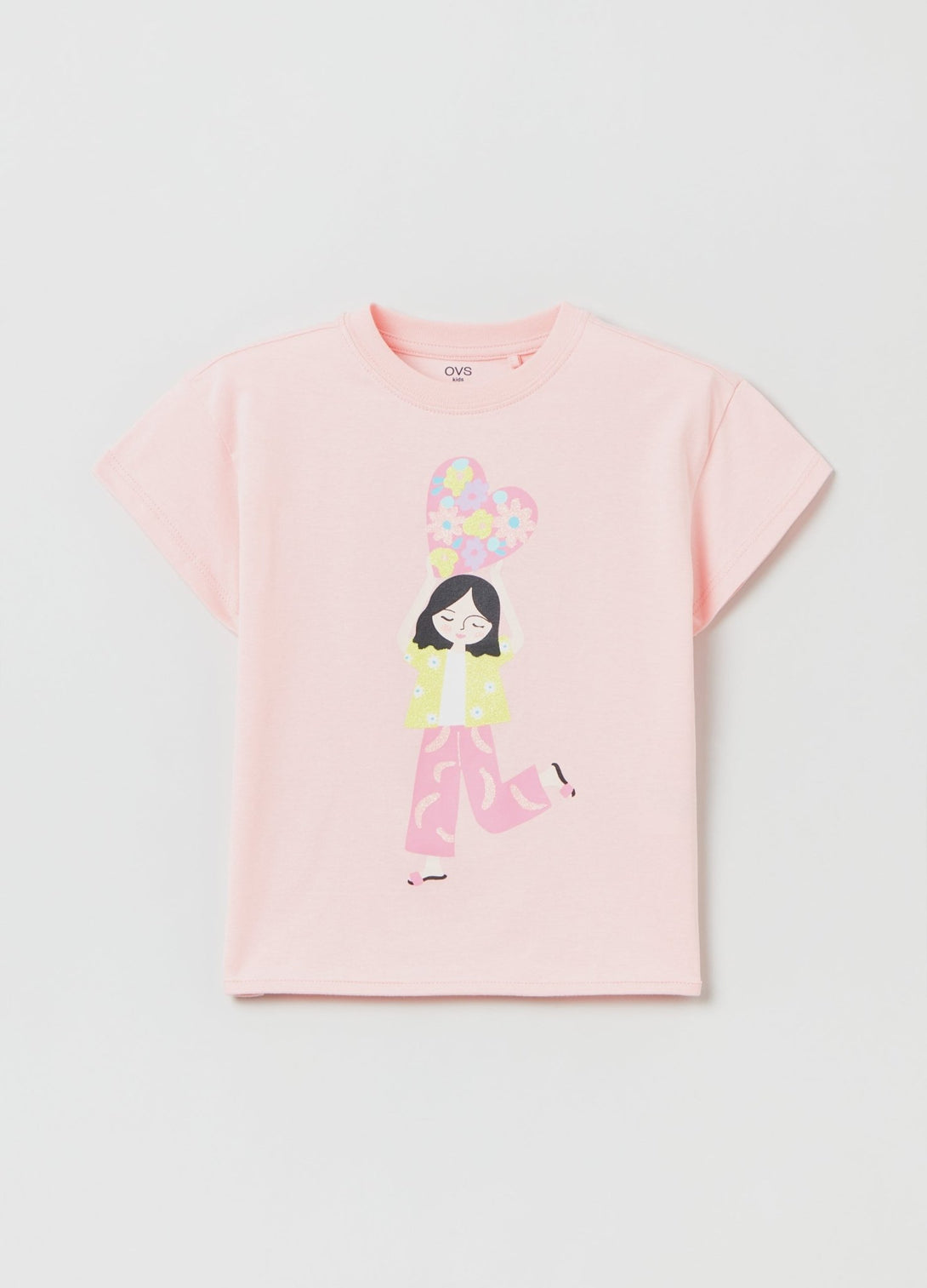 100% cotton T-shirt. Round neckline. Girl and heart print with glitter details.