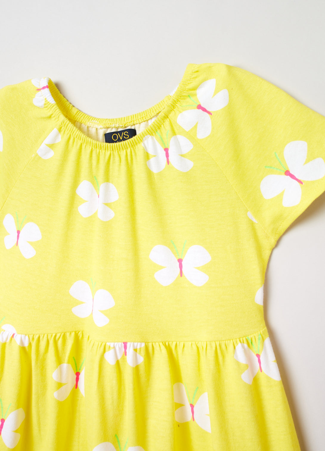 Dress in 100% cotton with flounce. Elasticated round neck. Short raglan sleeves. All-over butterfly print.