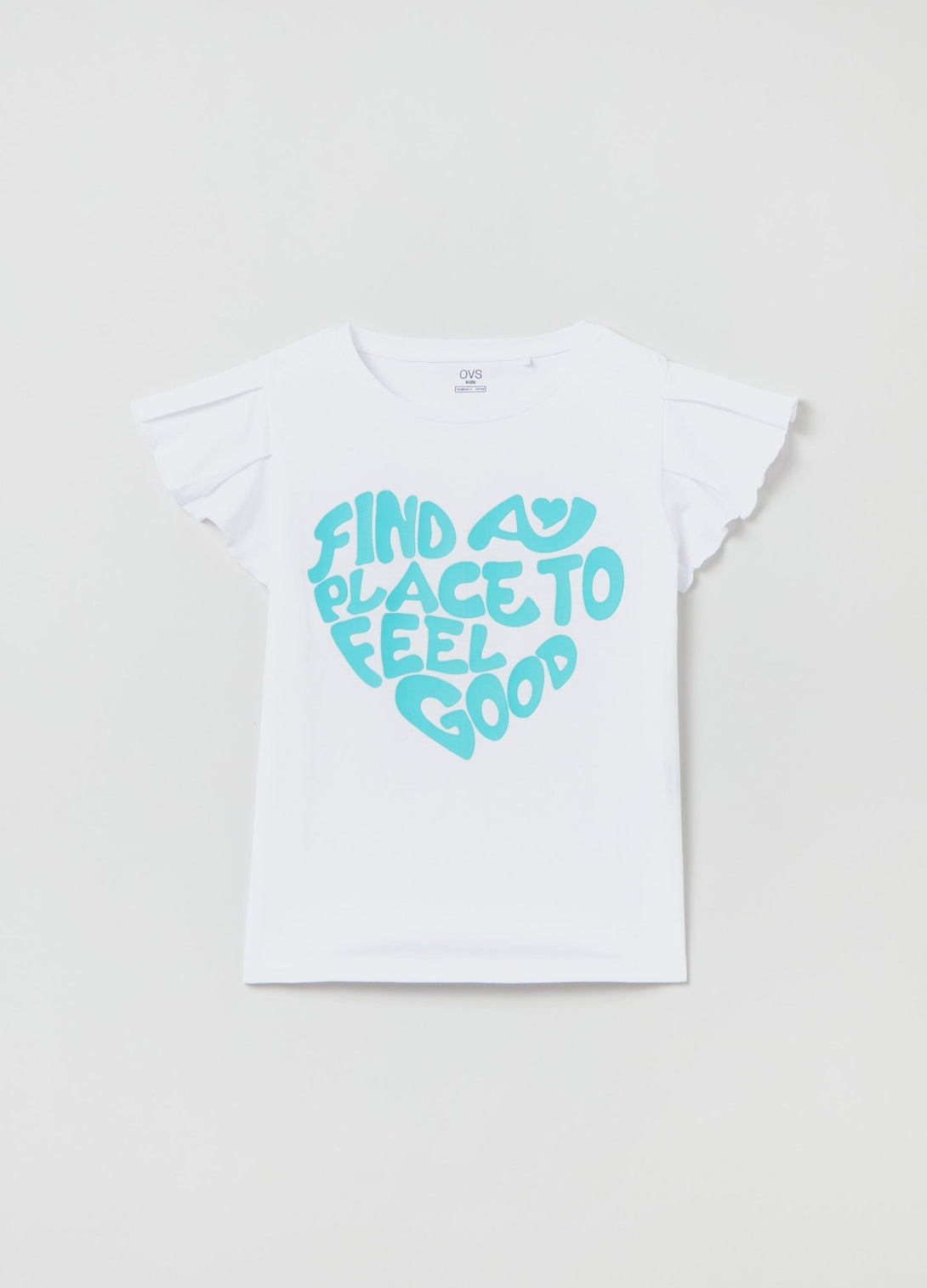 100% cotton T-shirt. Round neckline. Sleeves with flounce. Rubber lettering print on the front.