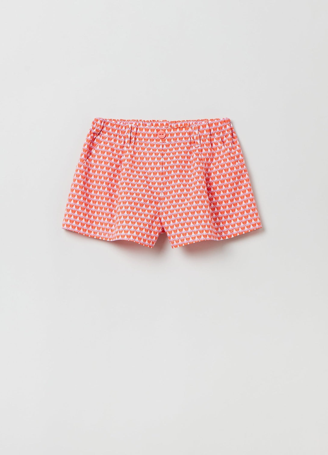 Lightweight poplin shorts in 100% cotton. Elastic waist band with inside adjustment. Decorative button on the front. Two slant pockets. All-over stylised flower print.