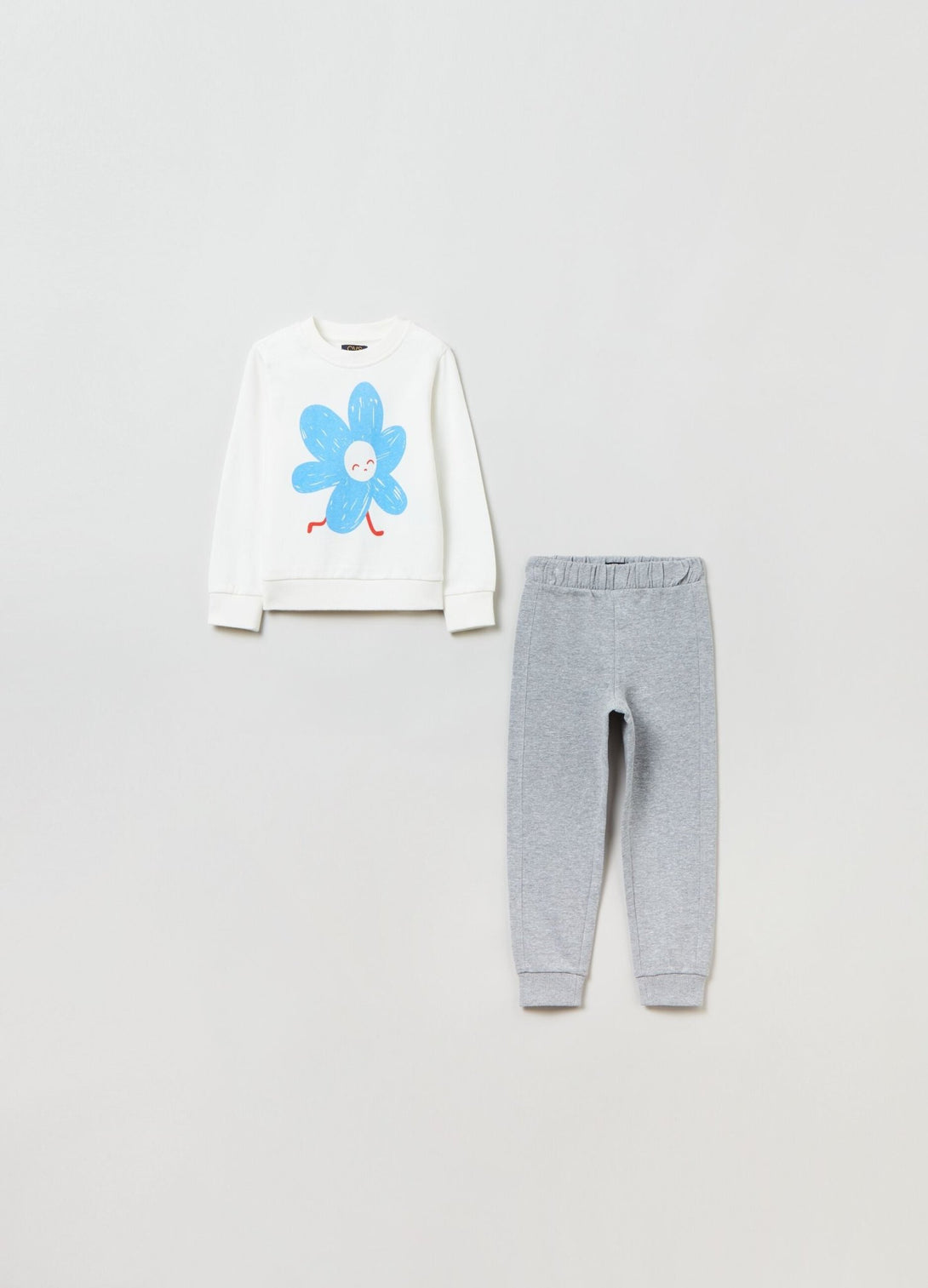 Jogging set in French terry (non-brushed fleece lining) consisting of 100% cotton top with round neck and joggers in cotton and mélange viscose. Top with flower print. Ribbed neck, cuffs and hem. Trousers with ribbed ankles and elasticated waist.