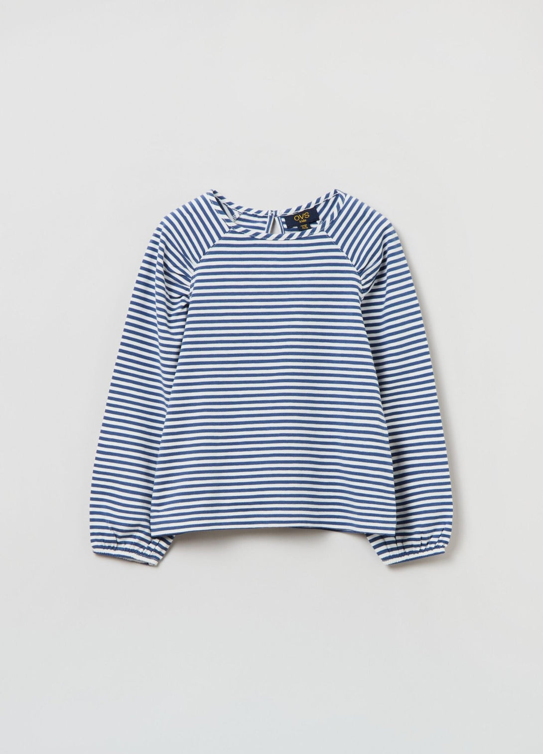 Stretch cotton striped T-shirt with round neck. Puff raglan sleeves with elasticated cuffs. Keyhole opening with button fastening on the back.