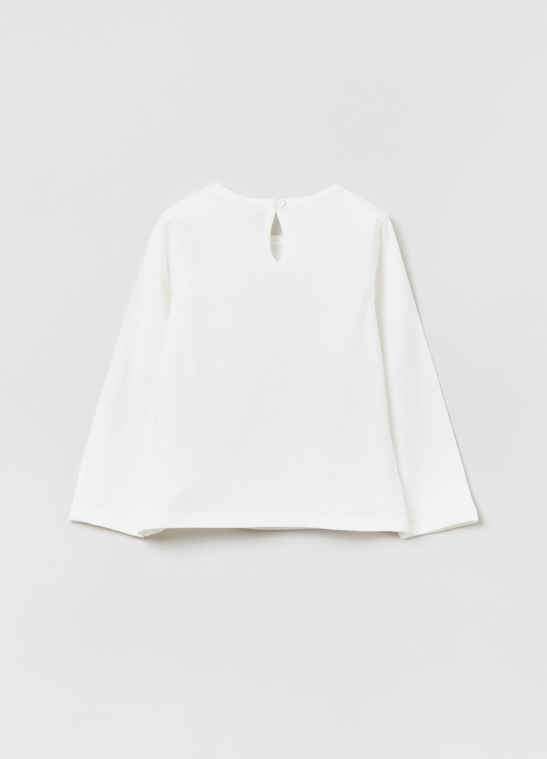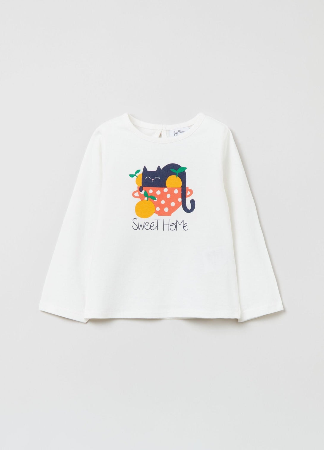 Long-sleeved T-shirt in 100% cotton. Round neck. Kitten print with fruit and lettering. Keyhole opening with button fastening on the back.